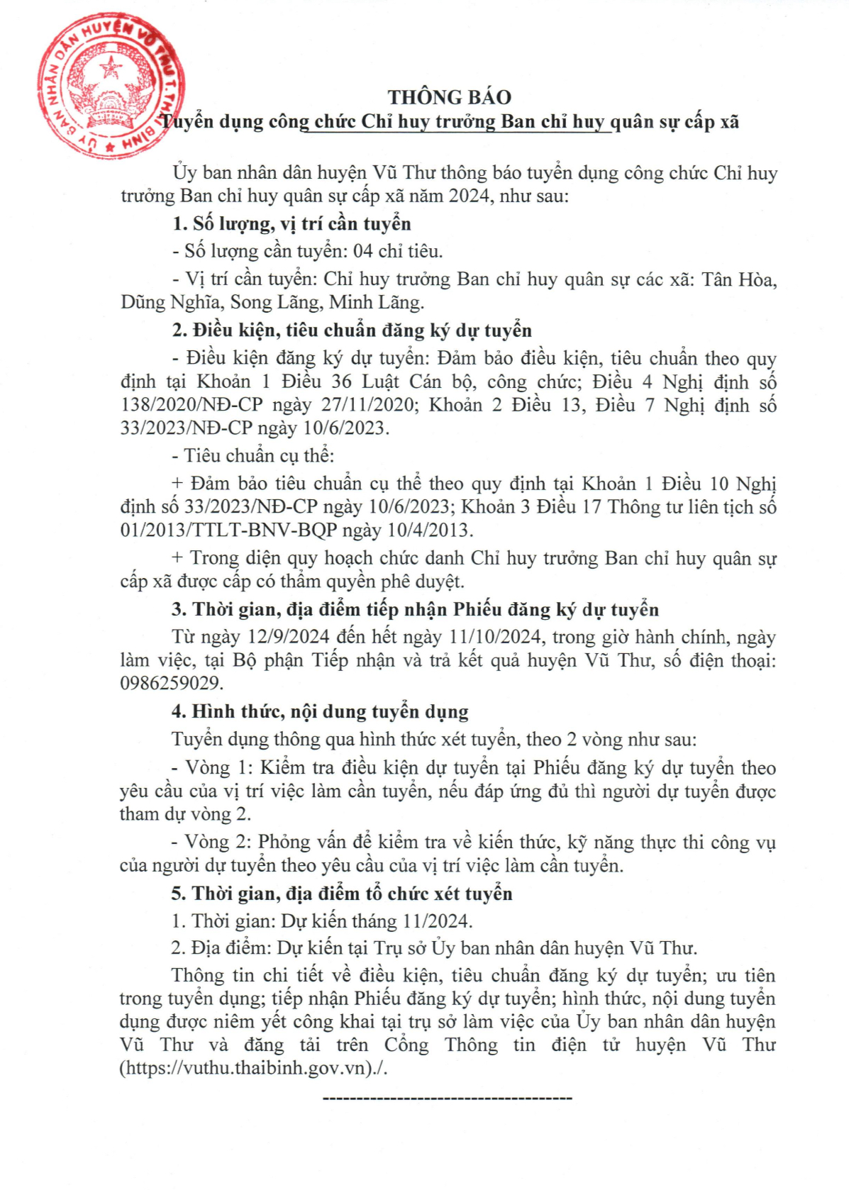 Thông báo tuyển dụng công chức Chỉ huy trưởng Ban chỉ huy quân sự cấp xã