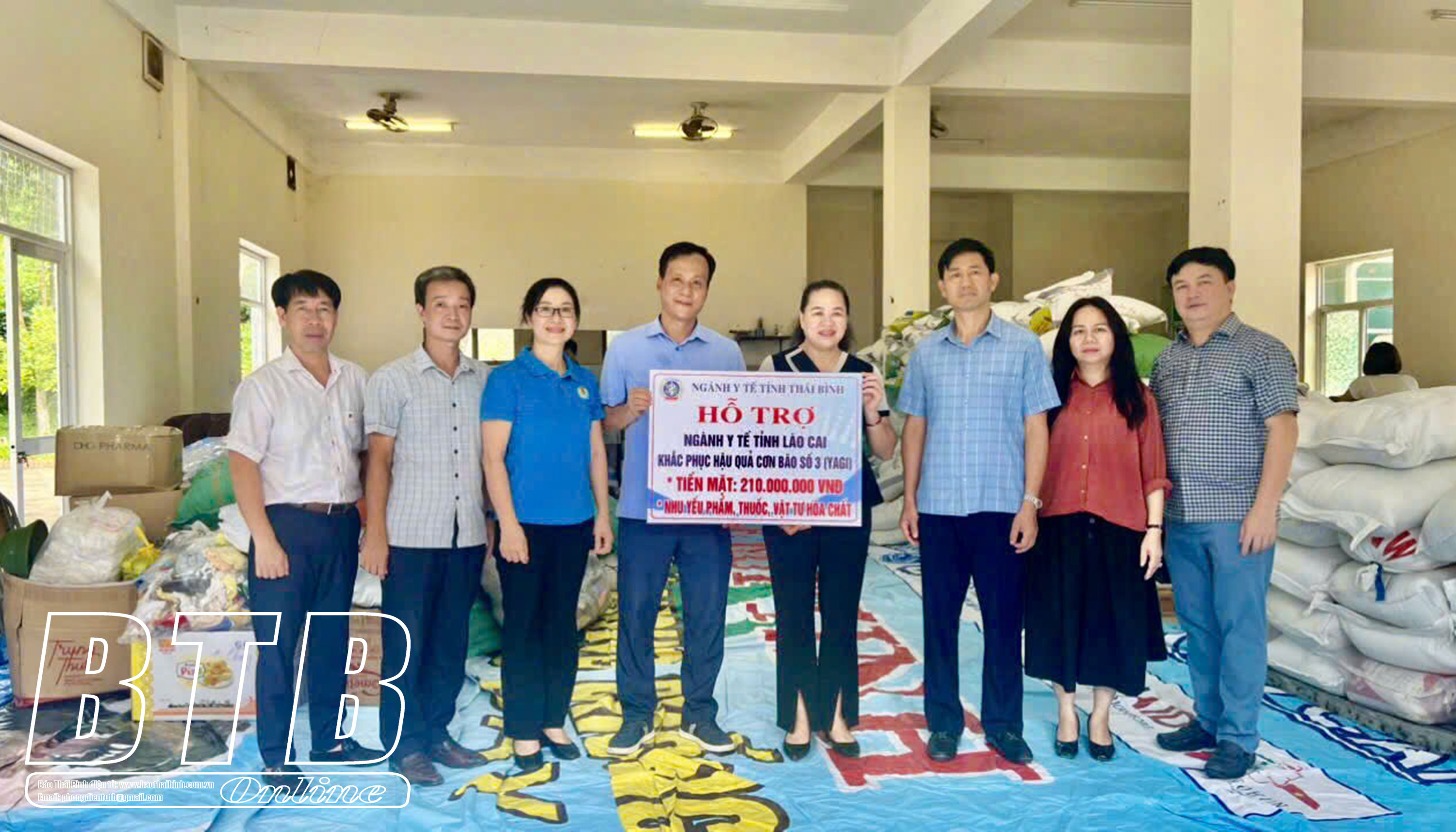Chia sẻ những khó khăn do ảnh hưởng của bão số 3 gây ra với các tỉnh Lào Cai, Cao Bằng, ngành y tế Thái Bình đã phát động các đơn vị y tế, công ty sản xuất, kinh doanh dược trên địa bàn tỉnh cùng cán bộ, công nhân viên chức toàn ngành ủng hộ tiền mặt, thuốc men, vật tư y tế và nhu yếu phẩm cần thiết. Tính đến hết ngày 19/9, ngành y tế Thái Bình đã huy động được hơn 13 tấn gạo, hơn 170 thùng thuốc thiết yếu, 420 triệu đồng tiền mặt cùng nhiều nhu yếu phẩm thiết yếu khác như: đèn pin, quần áo, dầu ăn, sạc pin dự phòng, áo phao, bếp ga mini, bình ắc quy, lương khô... để trao tặng hỗ trợ cho ngành y tế 2 tỉnh Lào Cai và Cao Bằng.