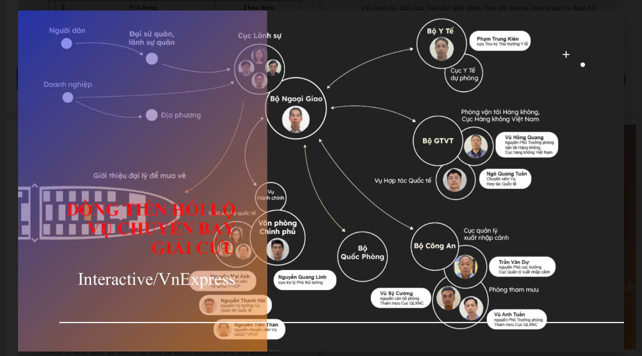 Hay như tác phẩm của Báo điện tử Vnexpress - một sản phẩm interactive về dòng tiền hối lộ vụ chuyến bay giải cứu với những hình ảnh chuyển động cho phép độc giả nhìn thấy và cảm nhận rõ nét toàn cảnh của vụ việc chấn động này, dòng tiền đi tới đâu?; ở những nhân vật nào?