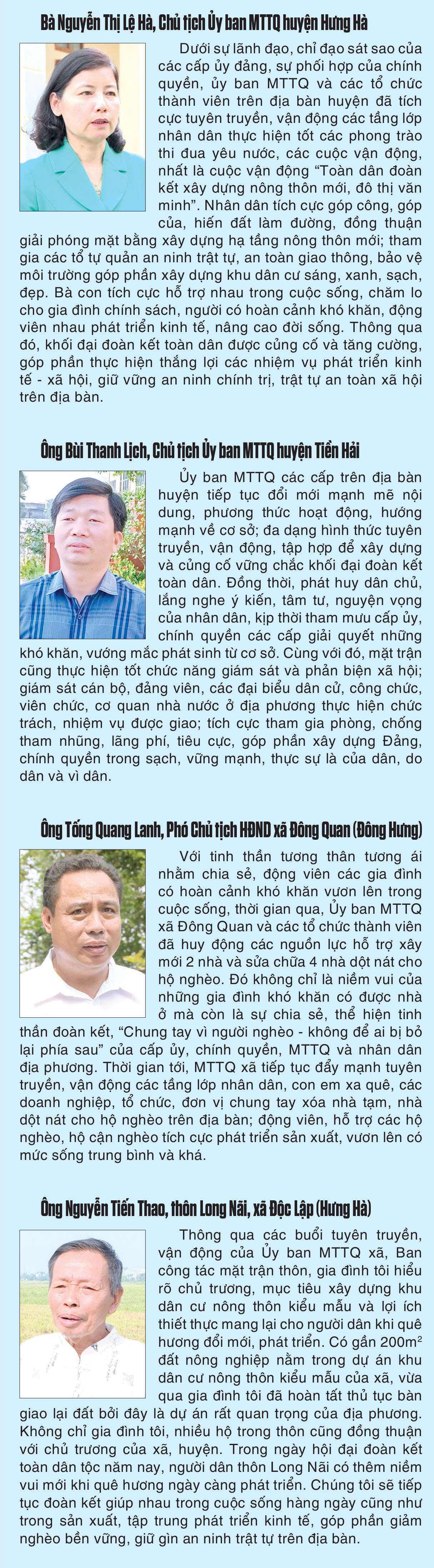 Tại Thái Bình, các cuộc vận động, các phong trào thi đua do ủy ban MTTQ các cấp và các tổ chức thành viên phát động được triển khai rộng khắp, có nhiều đổi mới, hướng mạnh về khu dân cư, góp phần huy động tiềm năng, sức sáng tạo, tinh thần tự nguyện, tự giác tham gia của các tầng lớp nhân dân, góp phần thực hiện thắng lợi các nhiệm vụ phát triển kinh tế - xã hội, bảo đảm quốc phòng, an ninh trên địa bàn tỉnh.