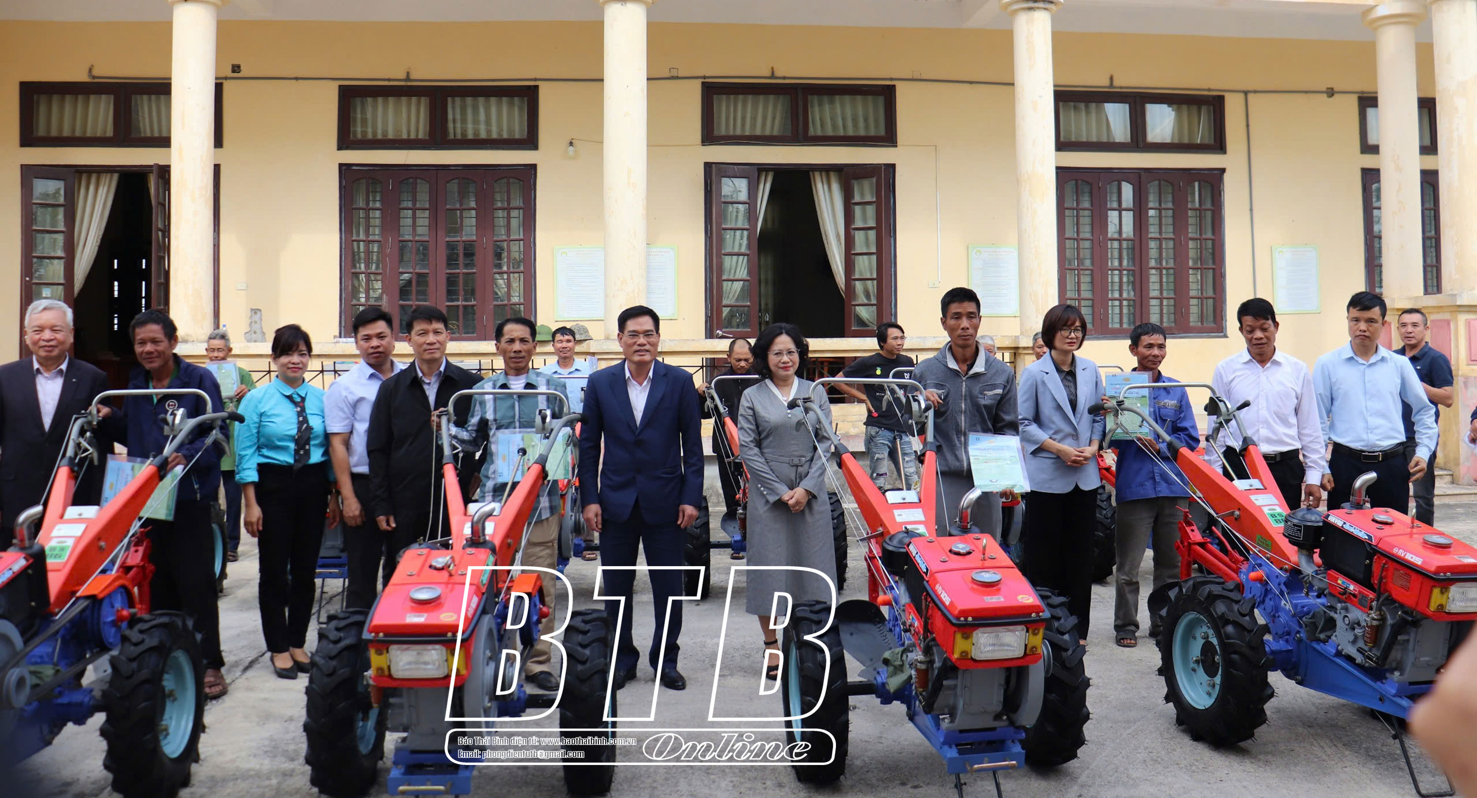 Lãnh đạo Bộ Công Thương, Sở Công Thương, Ủy ban MTTQ tỉnh, lãnh đạo huyện Quỳnh Phụ và nhà tài trợ trao máy cày cho các nông dân của huyện Quỳnh Phụ.