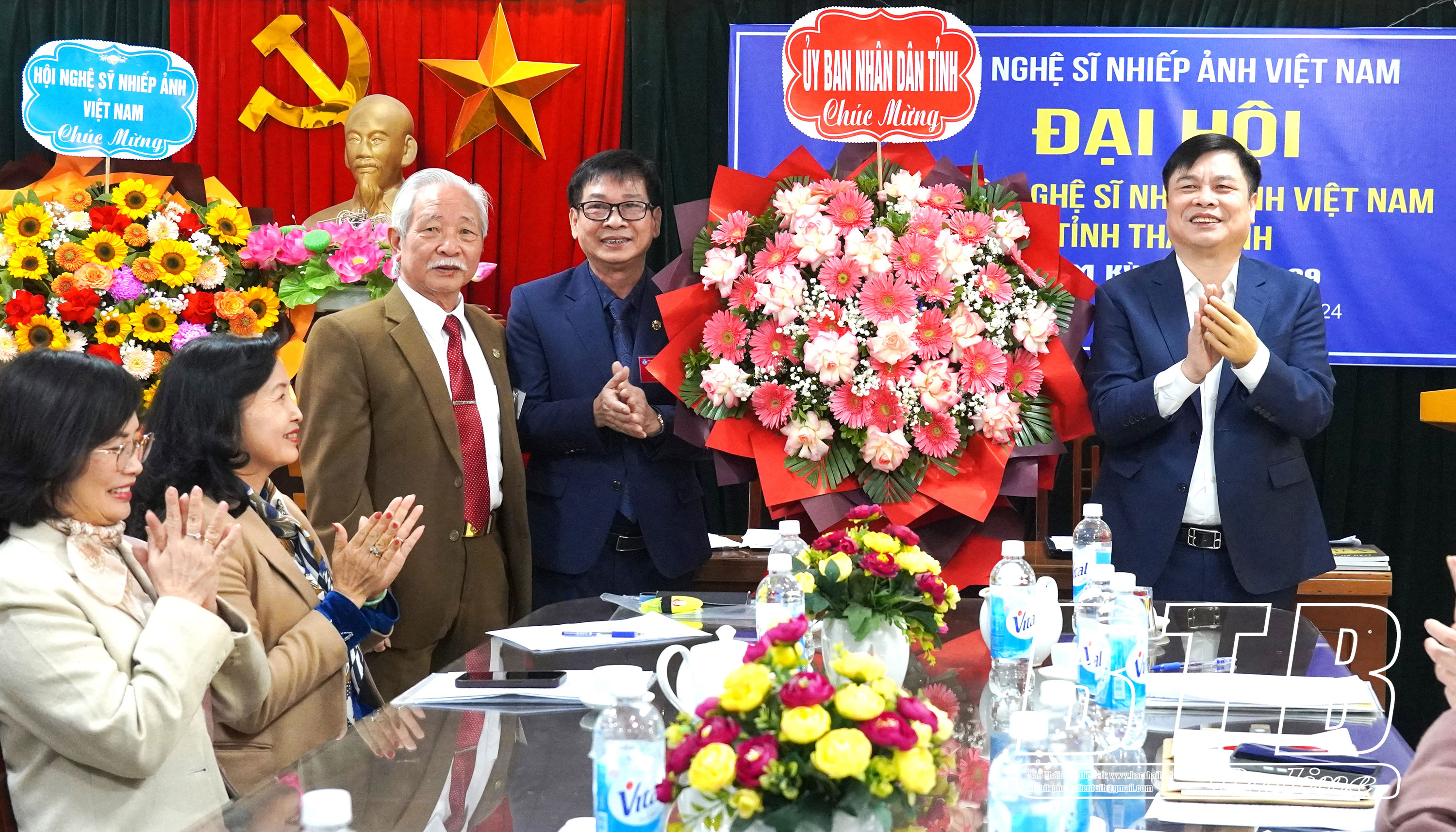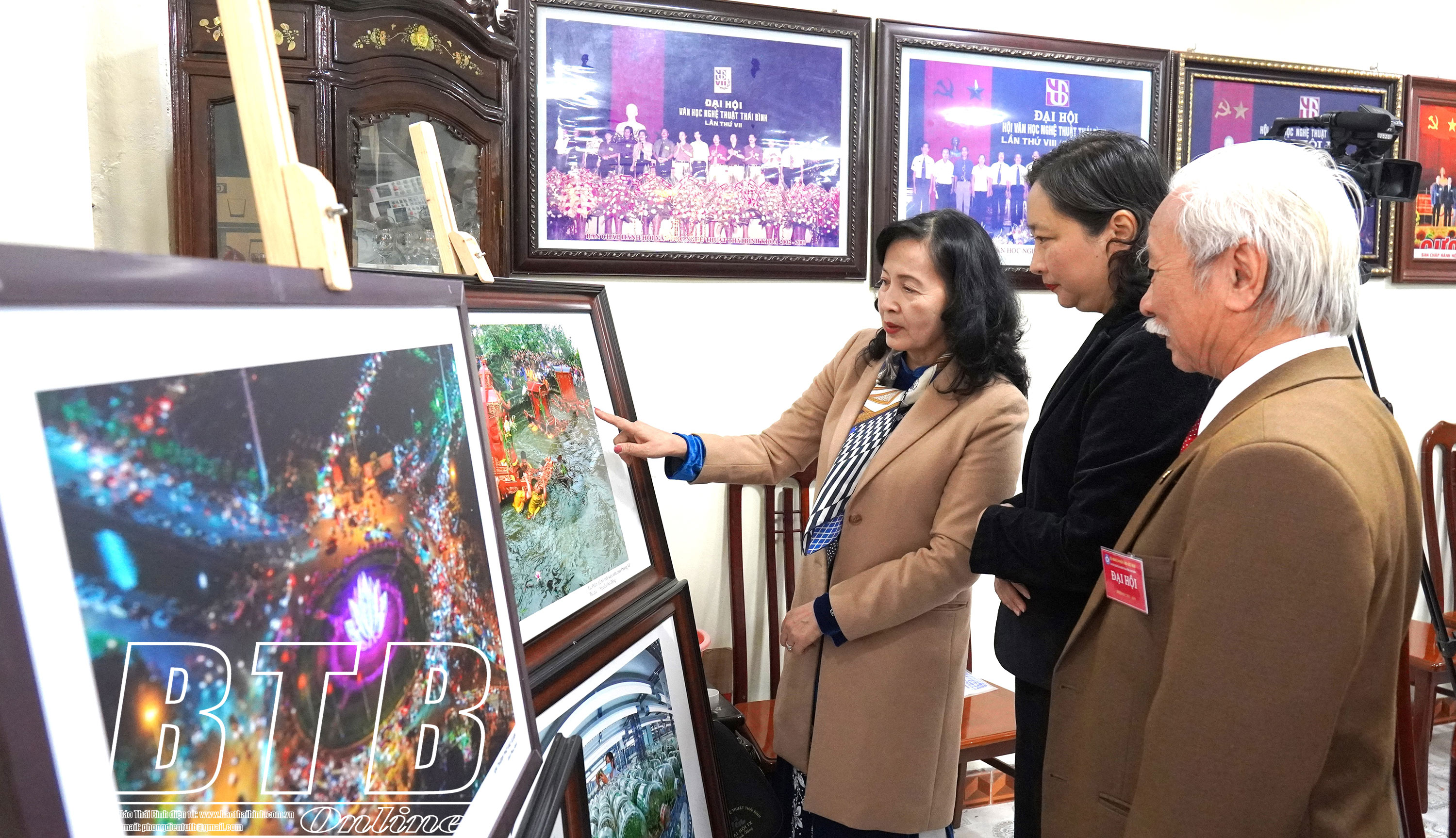 Các đại biểu chúc mừng Ban chấp hành khóa mới Chi hội Nghệ sĩ nhiếp ảnh tỉnh. Trưng bày tác phẩm ảnh xuất sắc của hội viên chi hội.