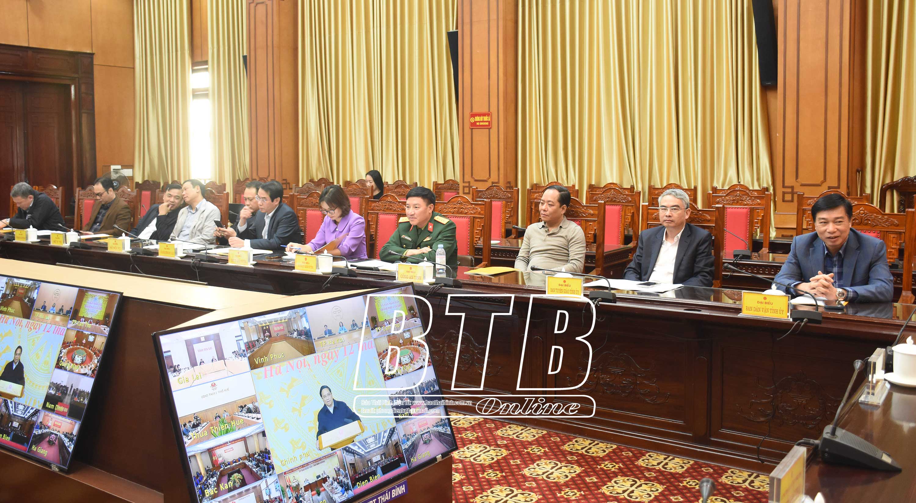 Dự phiên họp tại điểm cầu Thái Bình có các đồng chí: Nguyễn Khắc Thận, Bí thư Tỉnh ủy, Chủ tịch UBND tỉnh, Trưởng ban Chỉ đạo triển khai xóa nhà tạm, nhà dột nát trên địa bàn tỉnh; Đặng Thanh Giang, Ủy viên Ban Thường vụ Tỉnh ủy, Phó Chủ tịch thường trực HĐND tỉnh; các đồng chí thành viên Ban Chỉ đạo triển khai xóa nhà tạm, nhà dột nát trên địa bàn tỉnh.