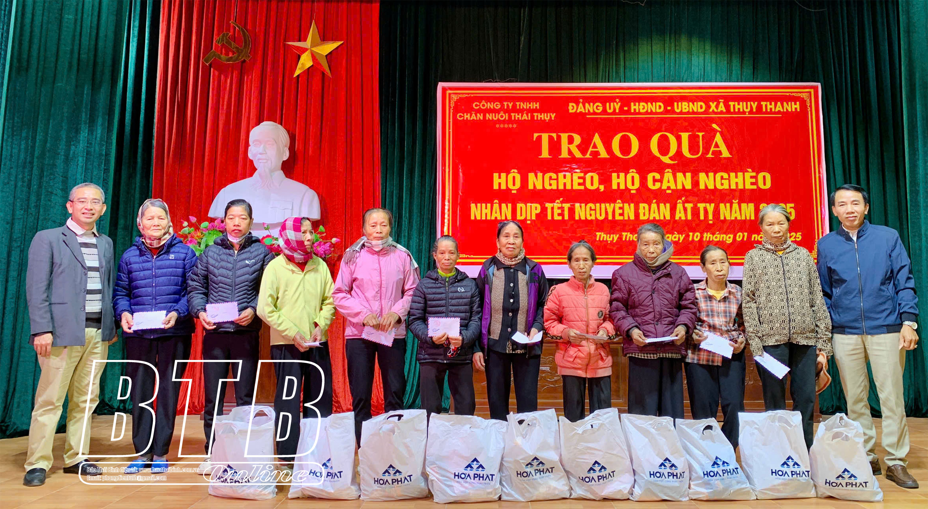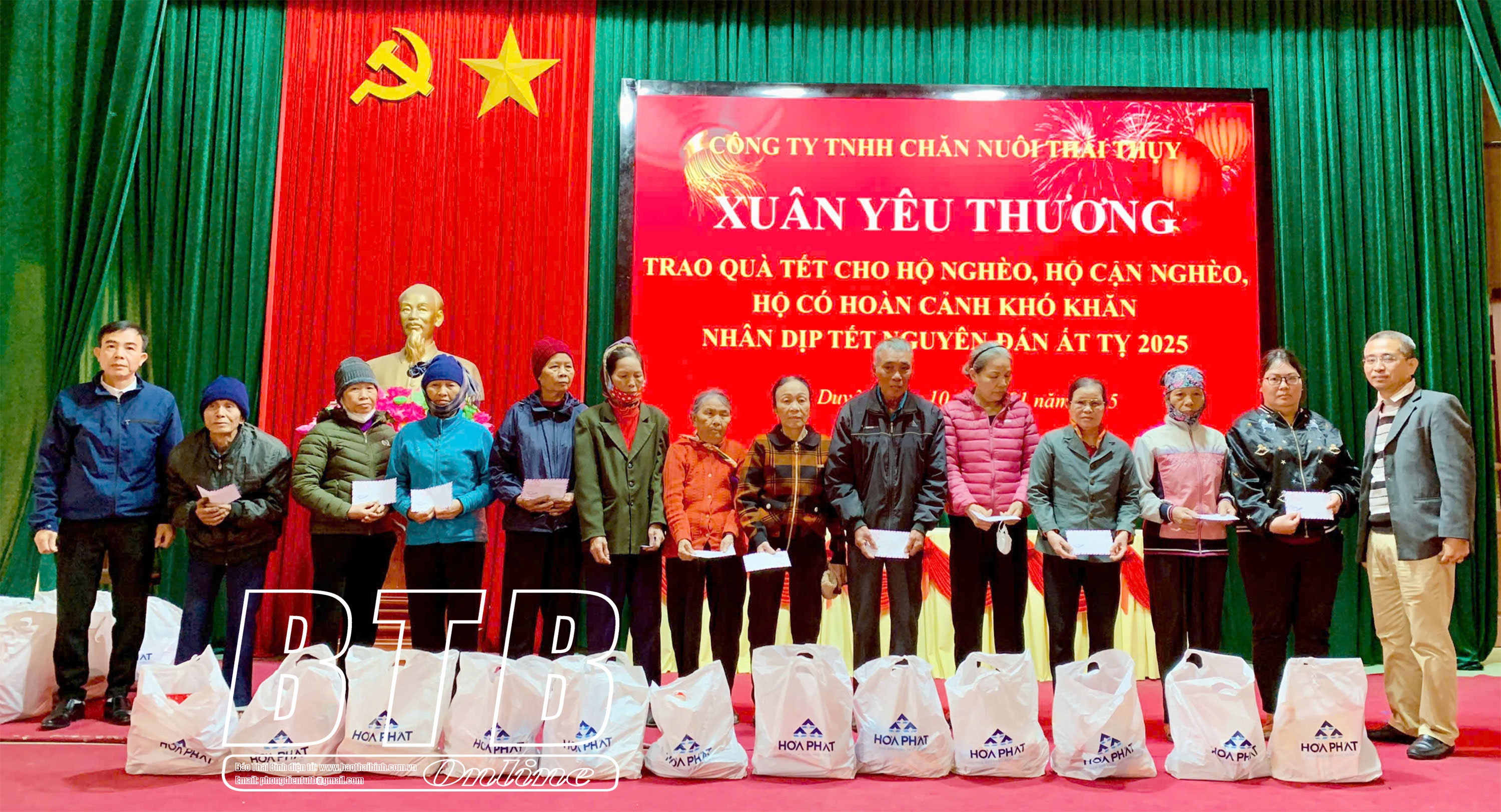 Theo đó, lãnh đạo các công ty chăn nuôi thuộc Tập đoàn Hòa Phát trên địa bàn tỉnh đã trao 160 suất quà cho hộ nghèo, hộ cận nghèo, người có hoàn cảnh khó khăn ở xã Hồng Minh, Chí Hòa (Hưng Hà), 78 suất quà ở xã Xuân Hòa (Vũ Thư), 105 suất quà ở xã Đồng Tiến (Quỳnh Phụ), 226 suất quà ở xã Thụy Thanh, Thụy Duyên, Thụy Chính (Thái Thụy), mỗi suất quà trị giá 400.000 đồng, trong đó 200.000 đồng tiền mặt và quà là các nhu yếu phẩm.