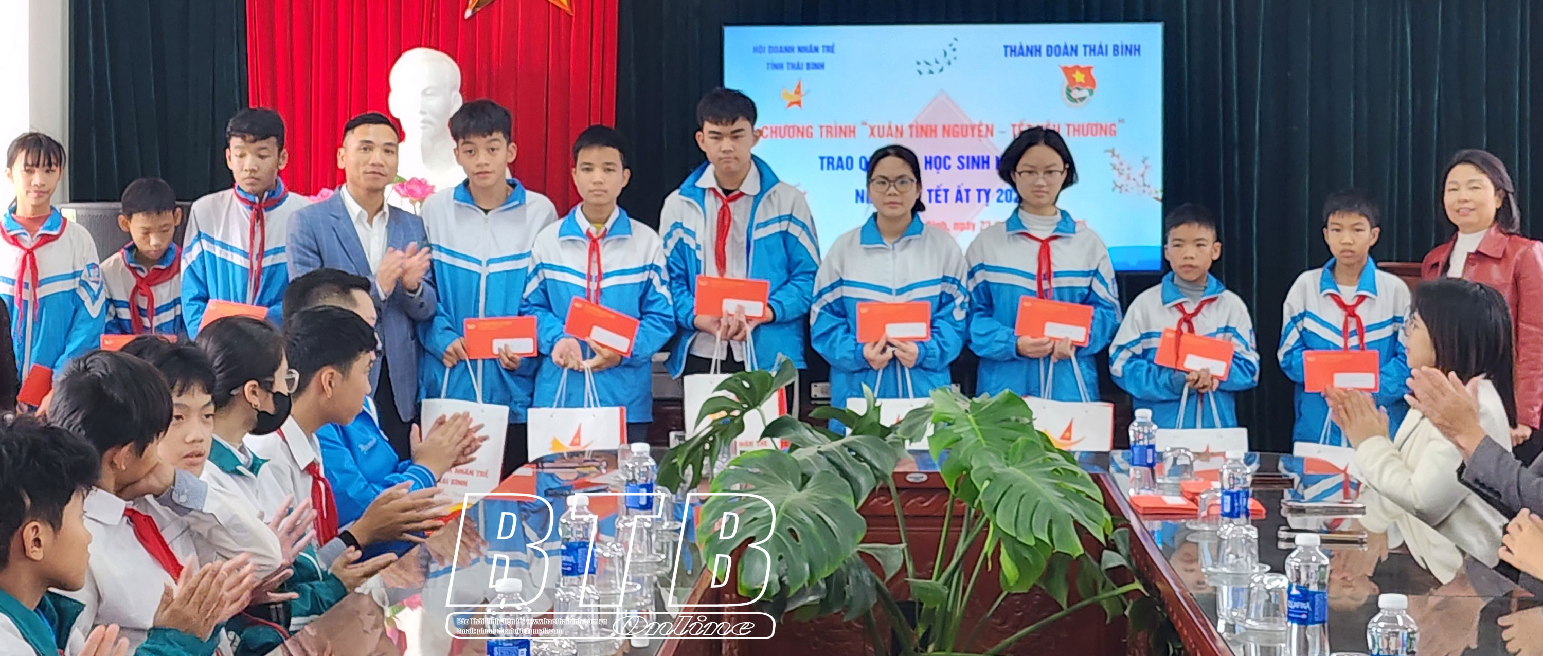 Sáng cùng ngày, Hội Doanh nhân trẻ Thái Bình đã trao 50 suất quà, mỗi suất trị giá 400.000 đồng cho học sinh có hoàn cảnh khó khăn đang học tại các trường THCS: Hoàng Diệu, Đông Mỹ, Vũ Đông (thành phố Thái Bình).