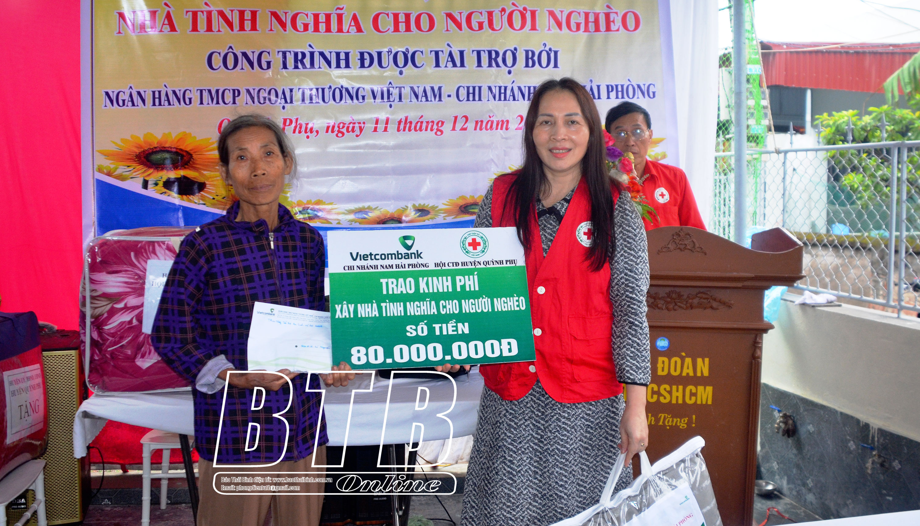 Lãnh đạo Hội Chữ thập đỏ huyện Quỳnh Phụ trao kinh phí hỗ trợ xây nhà của nhà tài trợ tới gia đình bà Nguyễn Thị Tuất, thôn Dụ Đại 1, xã Đông Hải.
