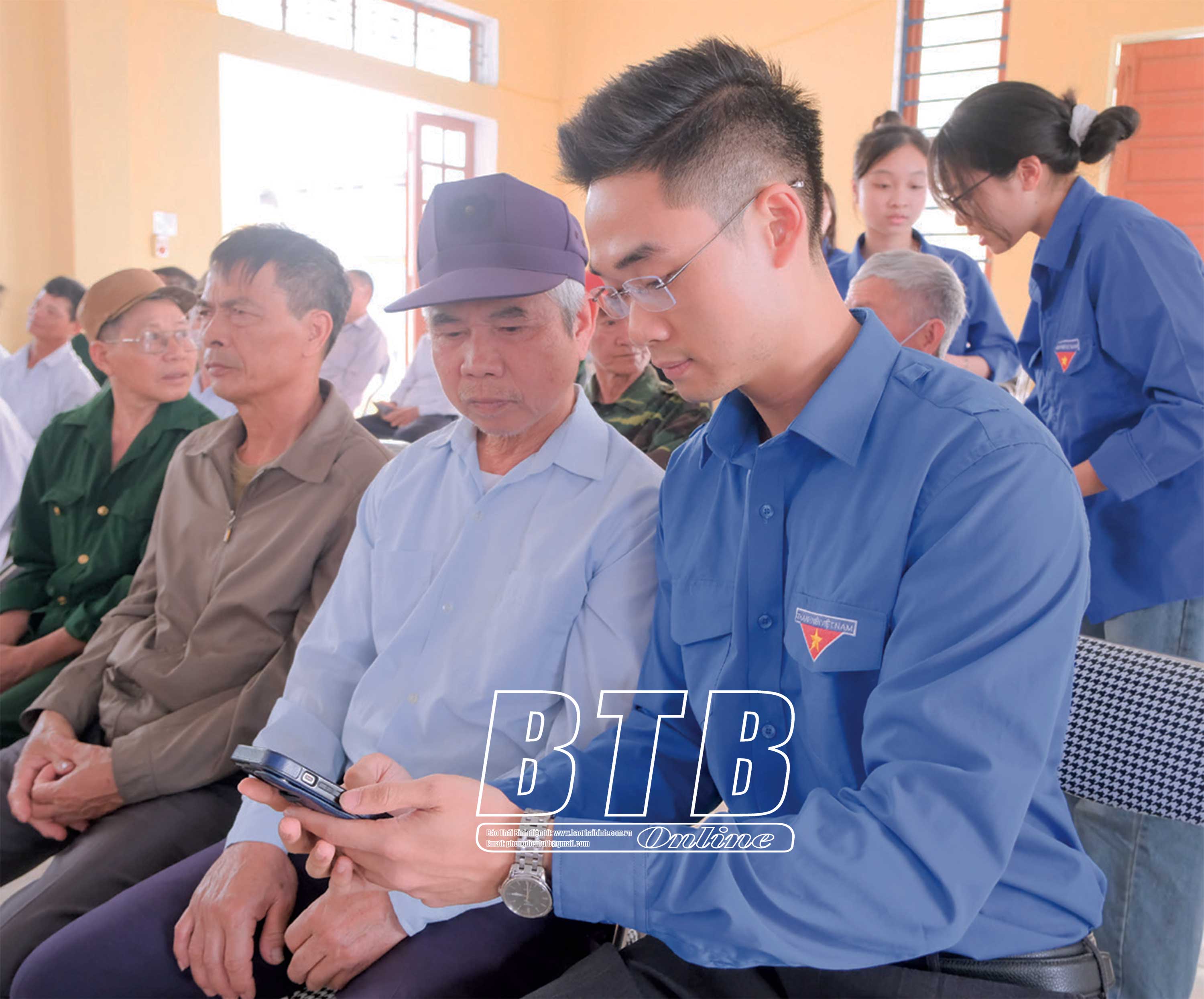 Tuổi trẻ xã Trang Bảo Xá (Quỳnh Phụ) hướng dẫn người dân thực hiện chuyển đổi số.