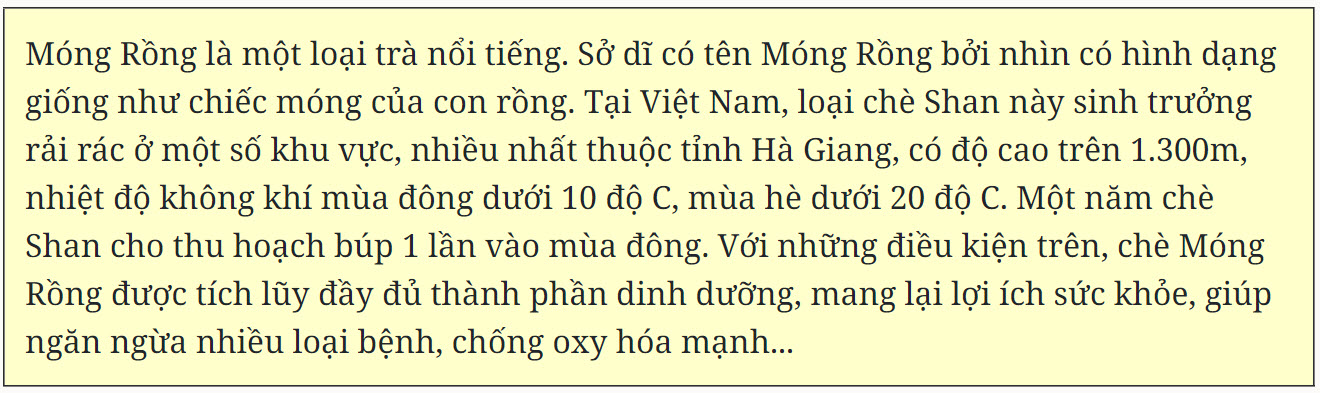 Tiếp tục khảo sát, đoàn nhận thấy búp chè, hay còn gọi măng chè có hình dạng đặc trưng - giống hình dạng móng của con rồng. Nghệ nhân Nguyễn Thị Hải cho biết: Chúng tôi cảm nhận đây như là chè Shan Móng Rồng rất có giá trị.