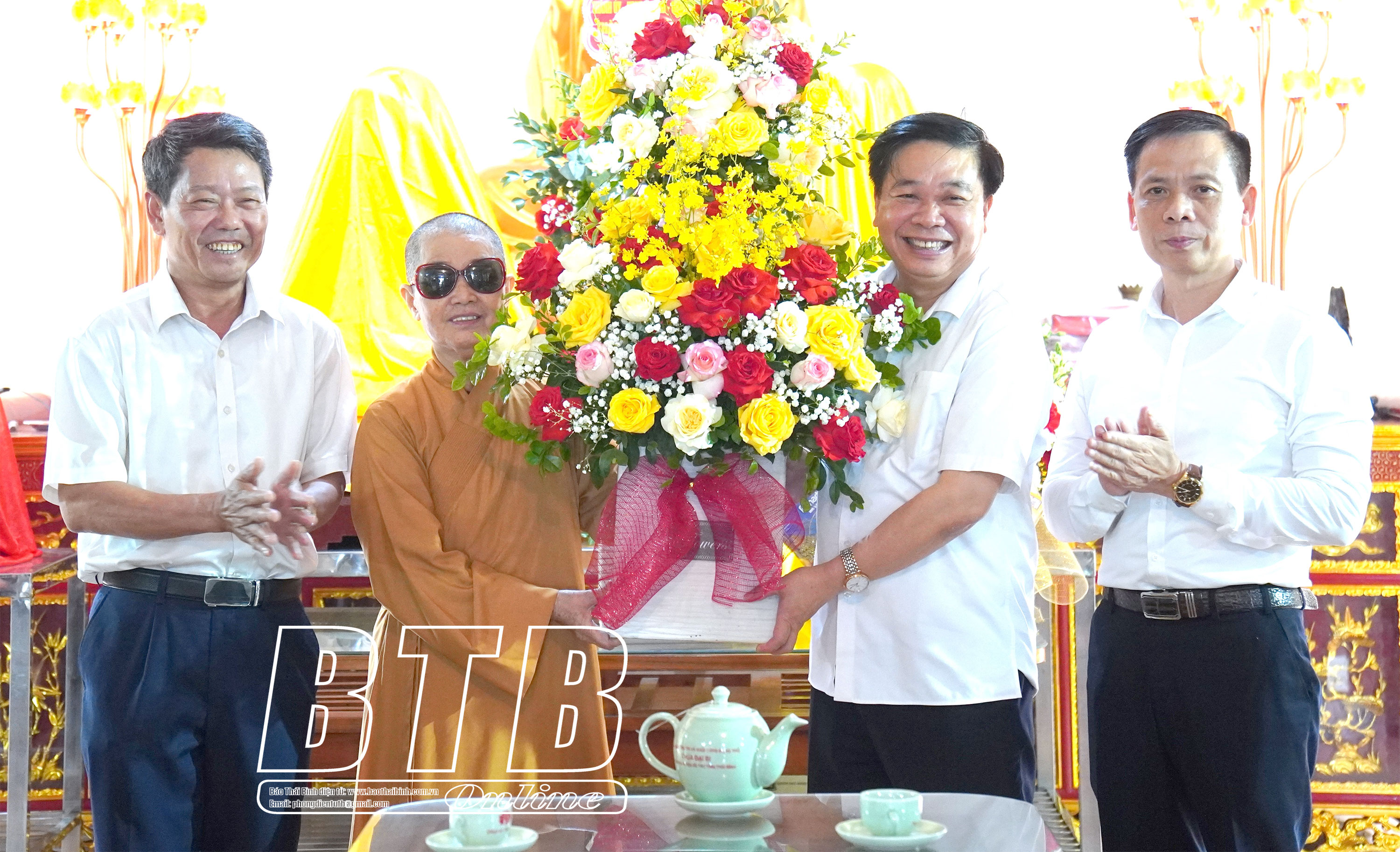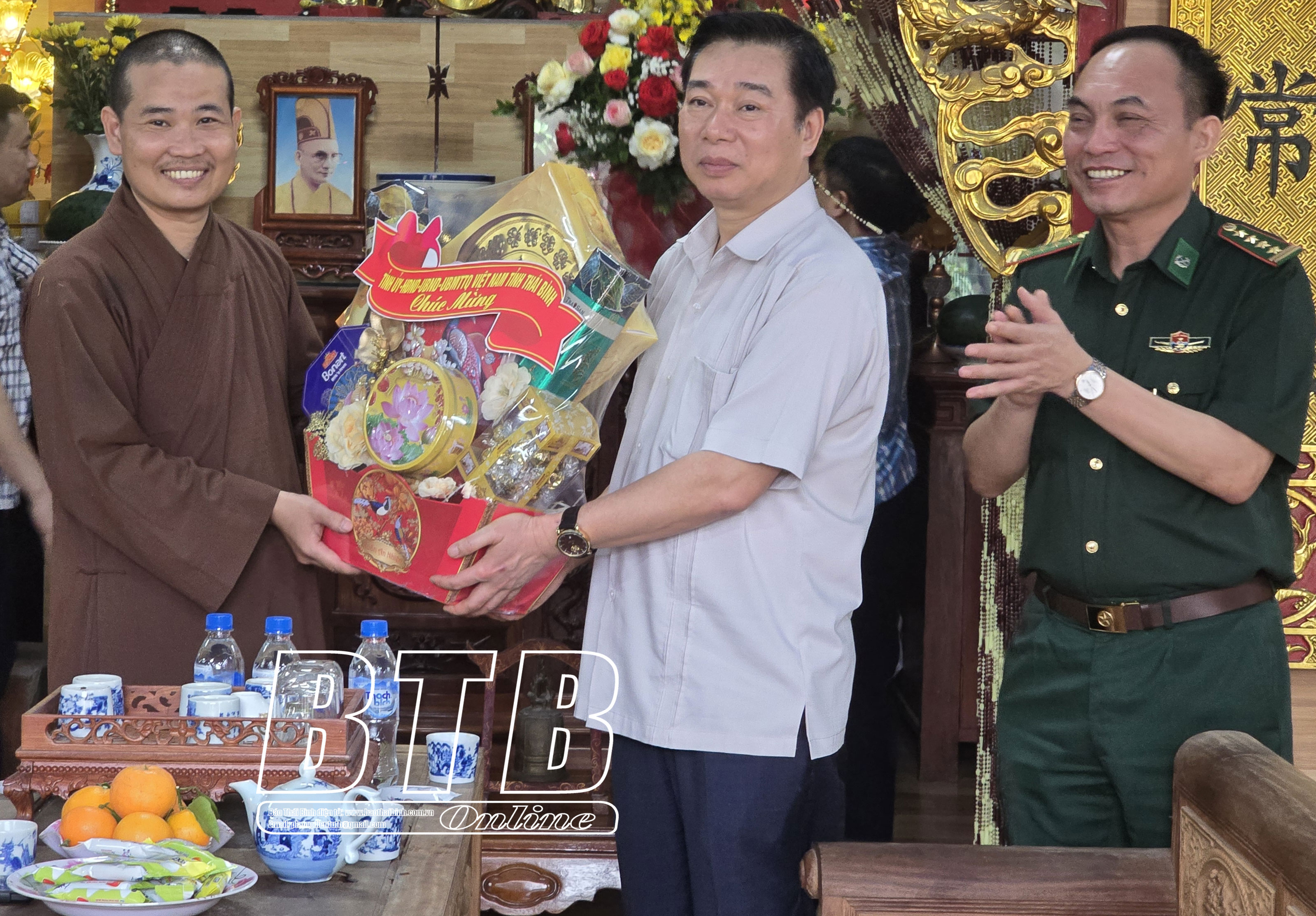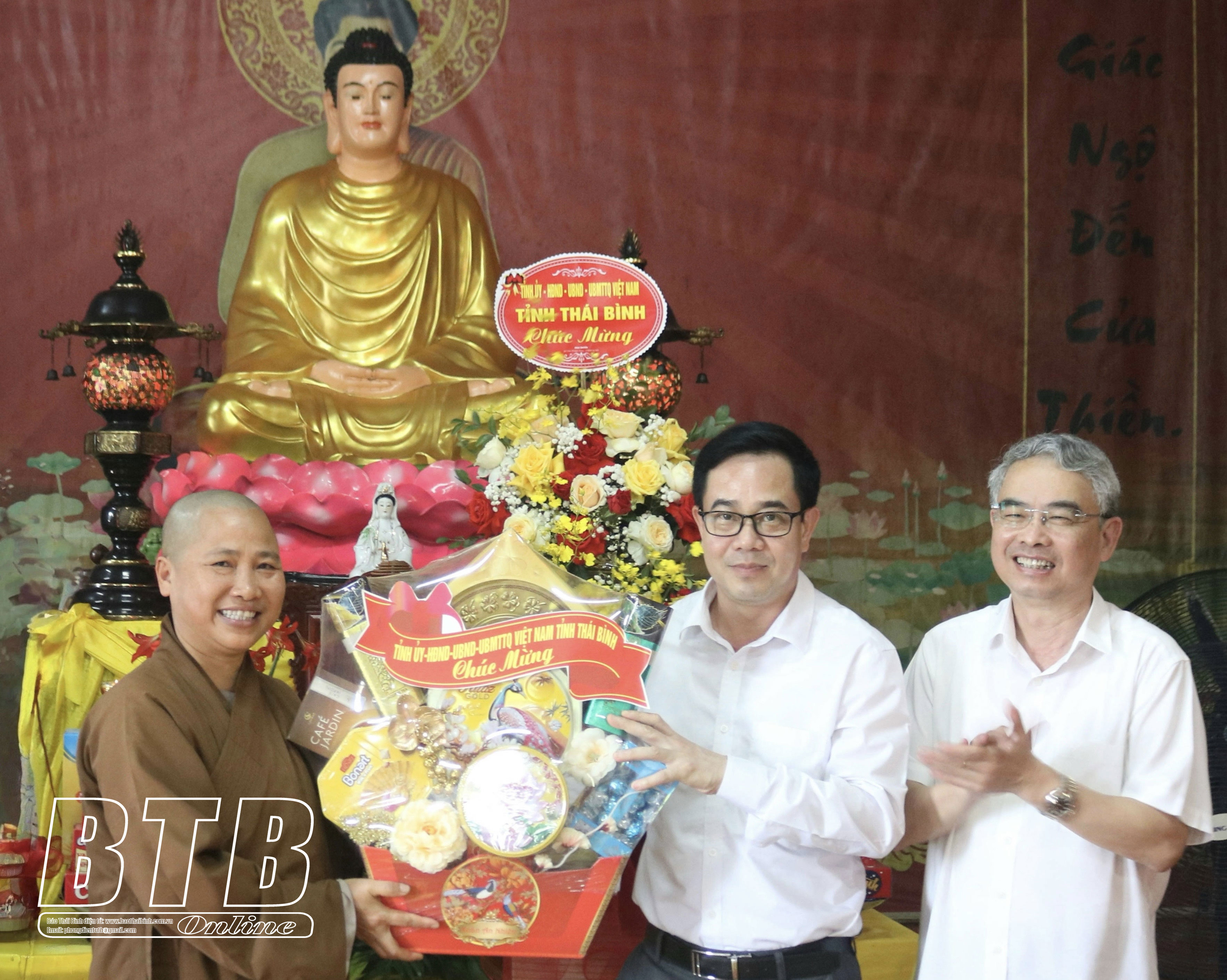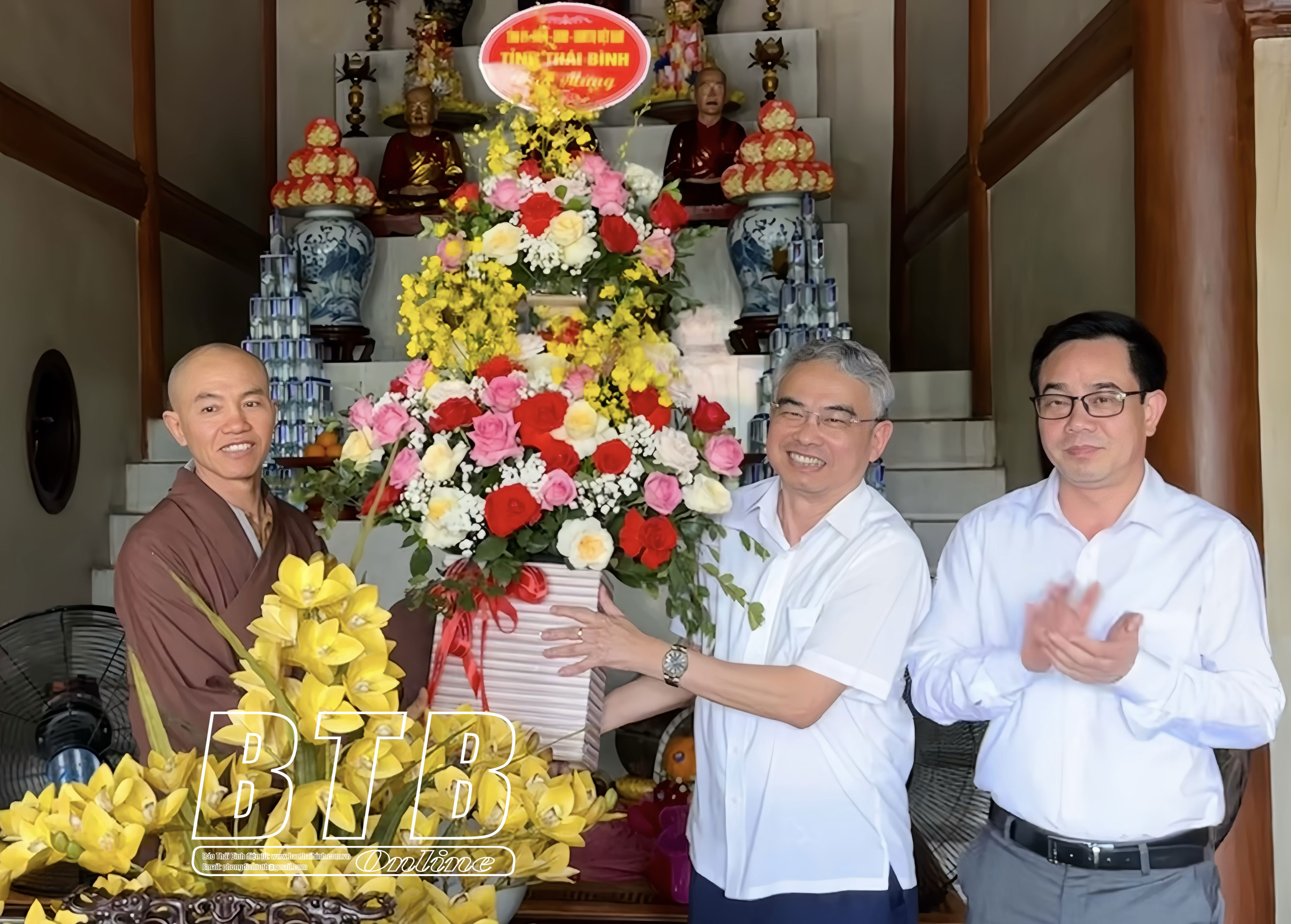 * Tại huyện Kiến XươngCác đồng chí: Phạm Đồng Thụy, Ủy viên Ban Thường vụ Tỉnh ủy, Trưởng ban Tuyên giáo và Dân vận Tỉnh ủy; Nguyễn Văn Huy, Tỉnh uỷ viên, Phó Trưởng đoàn đại biểu Quốc hội chuyên trách tỉnh chúc mừng Ni sư Thích Đàm Lương, Ủy viên Thường trực Ban Trị sự Giáo hội Phật giáo Việt Nam tỉnh, Trưởng Phân ban Ni giới Ban Trị sự Giáo hội Phật giáo Việt Nam tỉnh, trụ trì chùa Thủy Vân, xã Minh Quang (Kiến Xương). Ảnh: Hà MyCác đồng chí: Phạm Đồng Thụy, Ủy viên Ban Thường vụ Tỉnh ủy, Trưởng ban Tuyên giáo và Dân vận Tỉnh ủy; Nguyễn Văn Huy, Tỉnh ủy viên, Phó Trưởng đoàn đại biểu Quốc hội chuyên trách tỉnh chúc mừng Đại đức Thích Thanh Tùng, Ủy viên Thường trực Ban Trị sự Giáo hội Phật giáo Việt Nam tỉnh, Trưởng ban Trị sự Giáo hội Phật giáo huyện Kiến Xương, trụ trì chùa Bảo Trai, xã Vũ Quý (Kiến Xương). Ảnh: Hà My