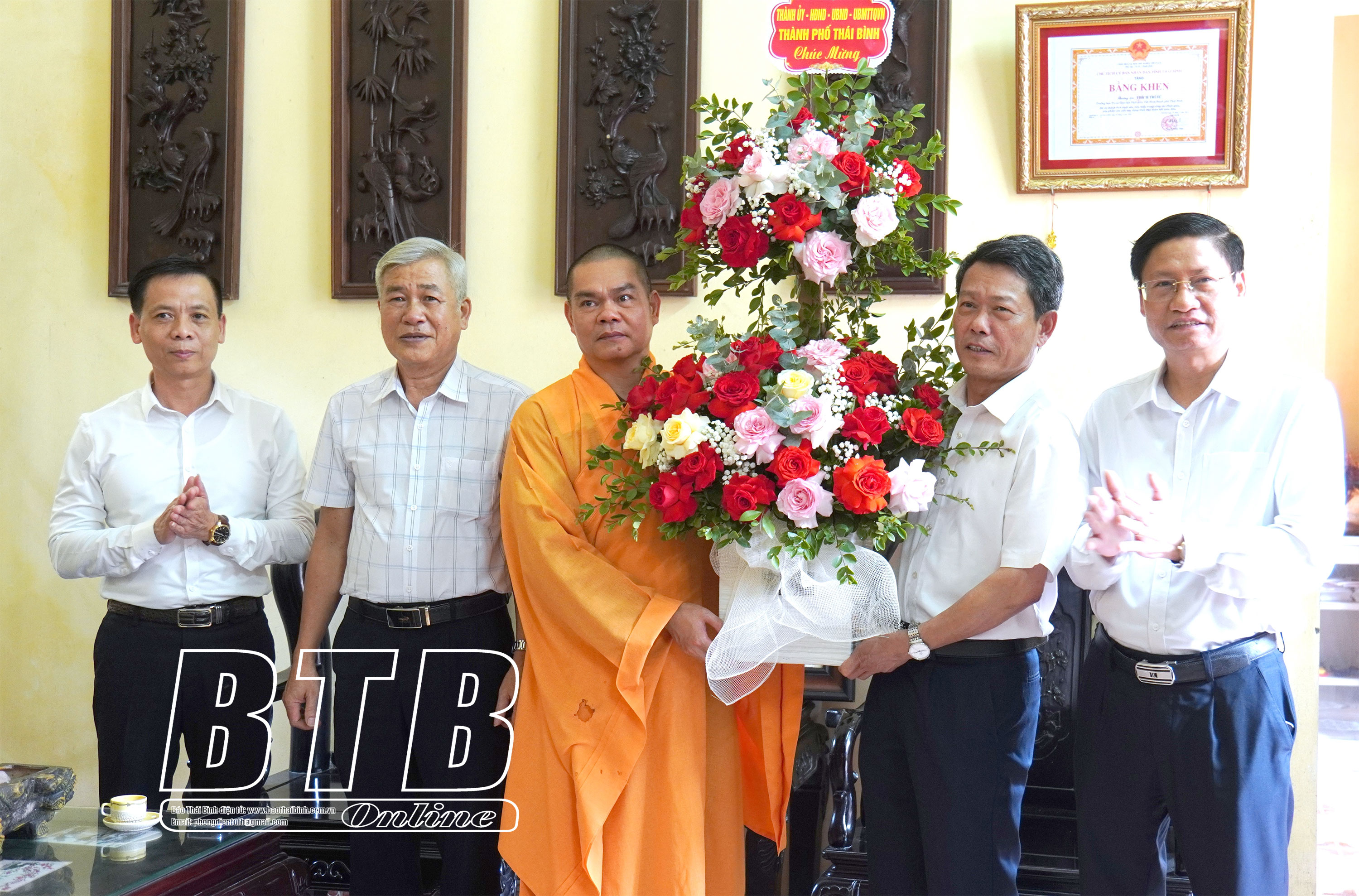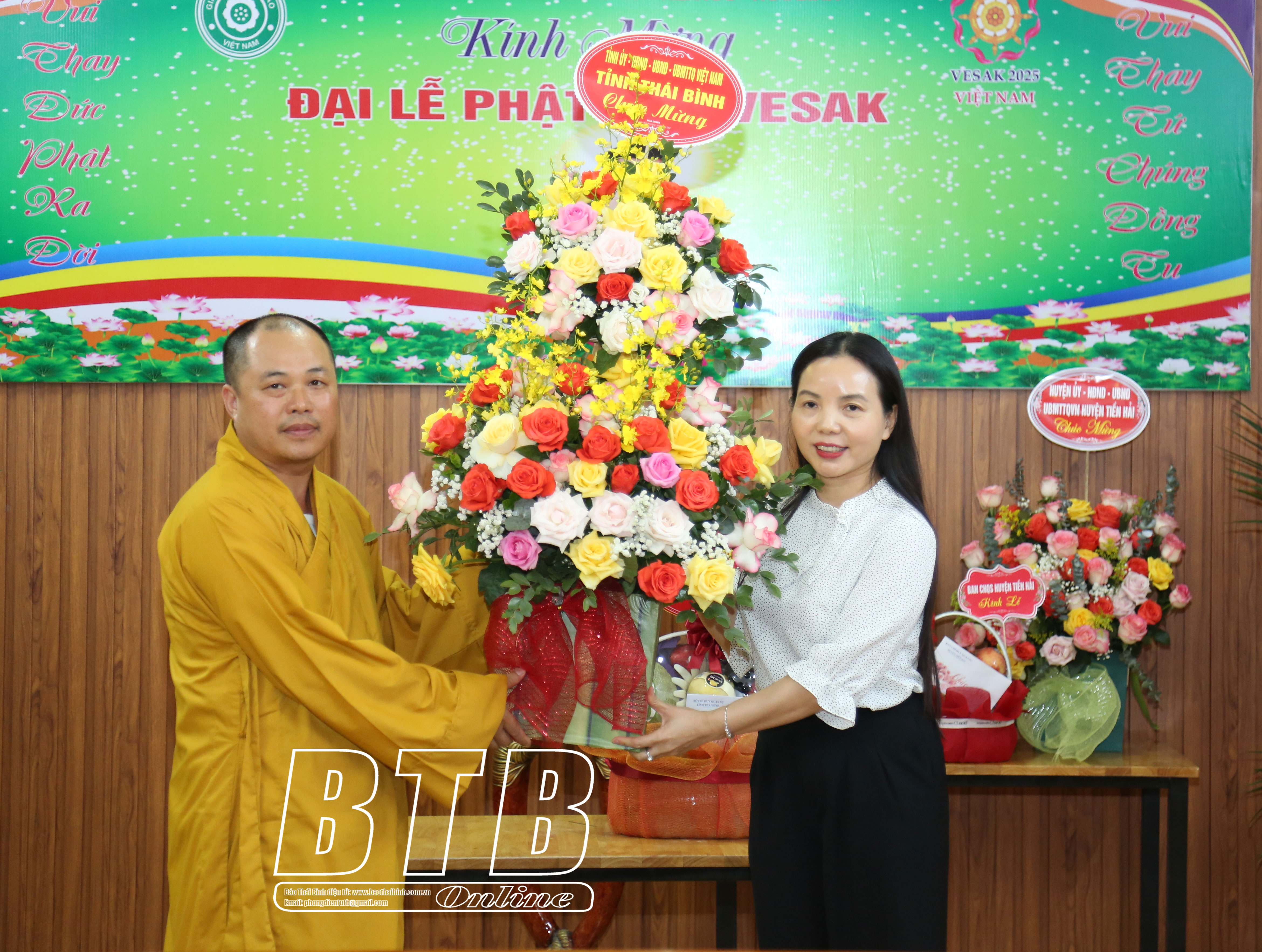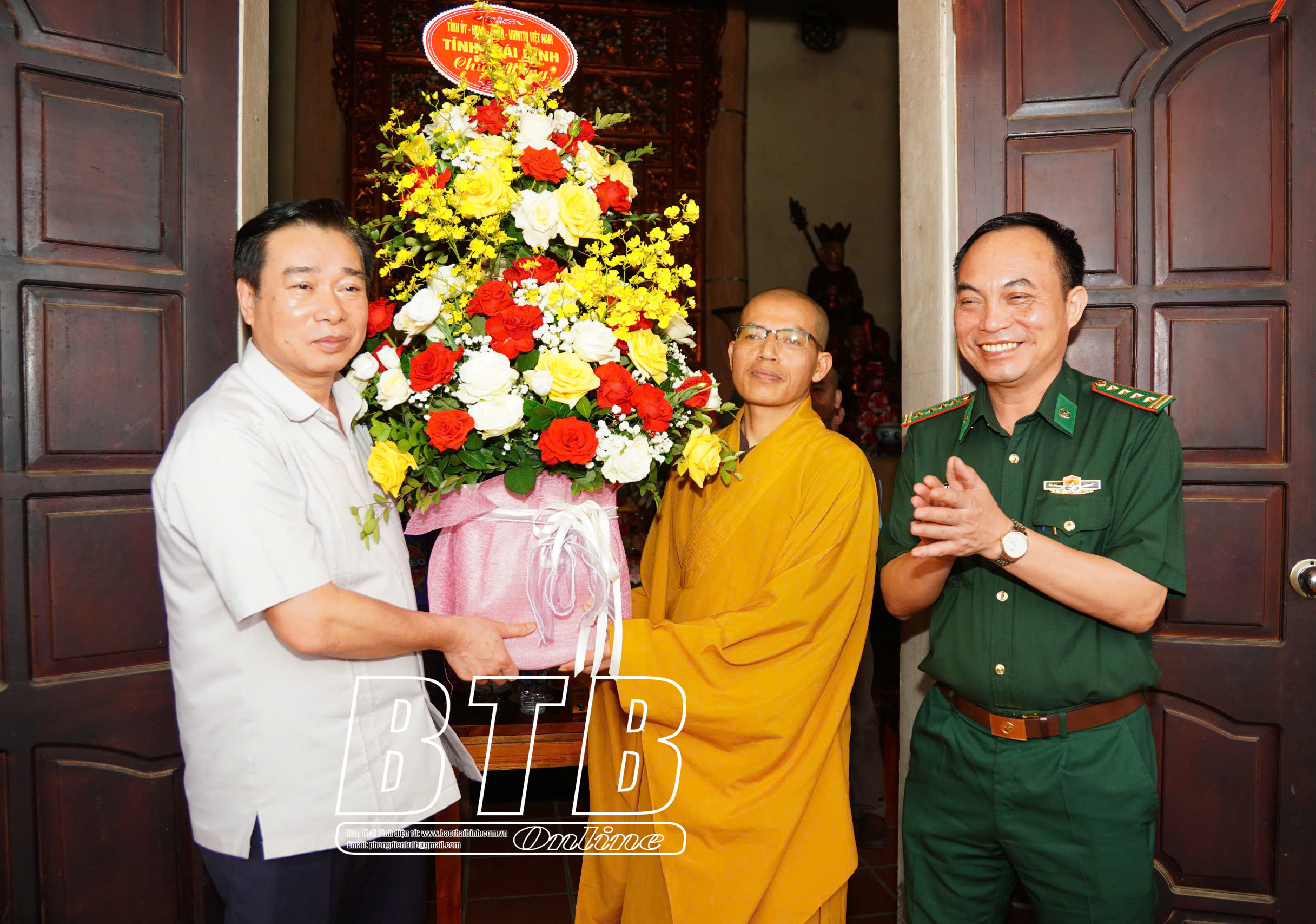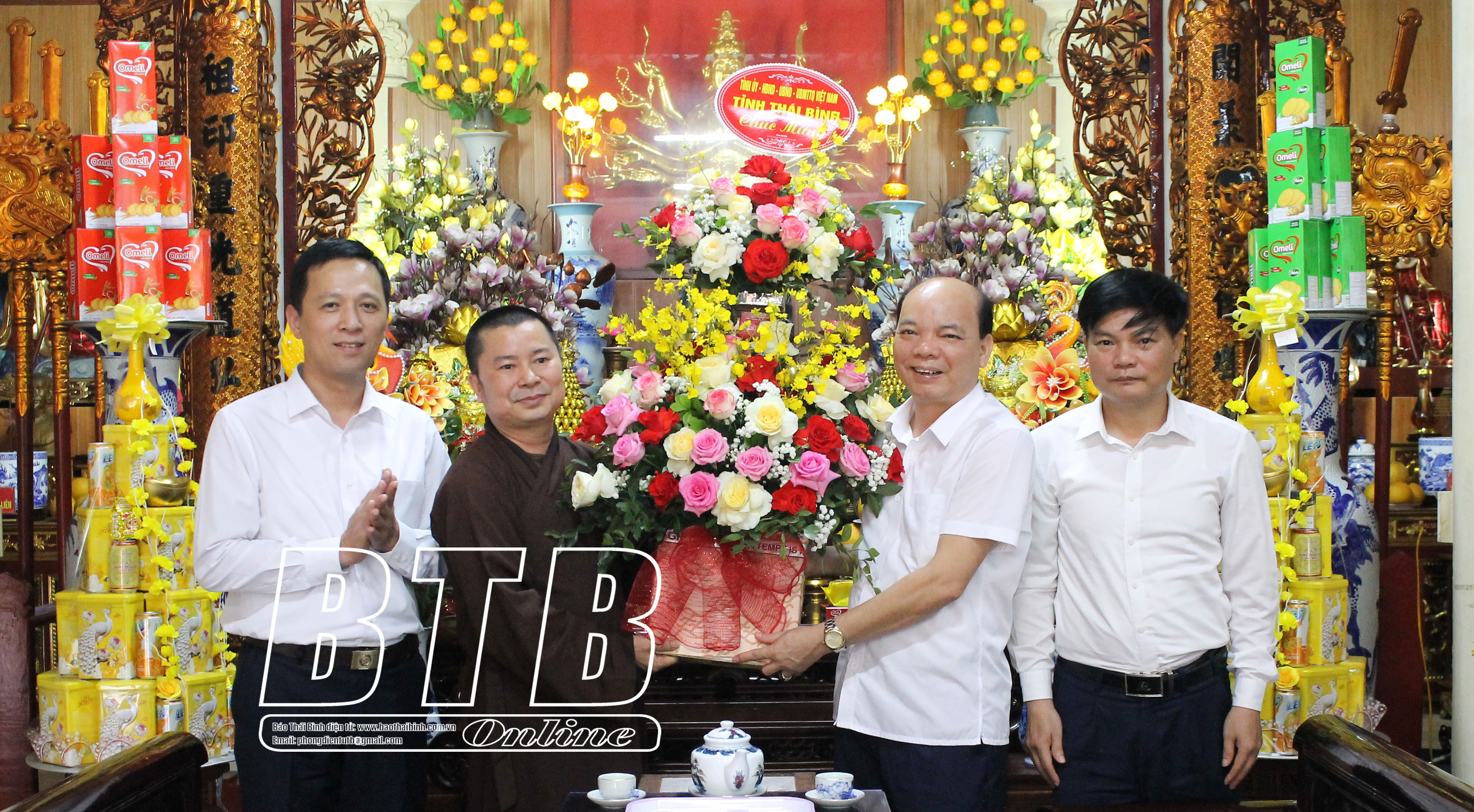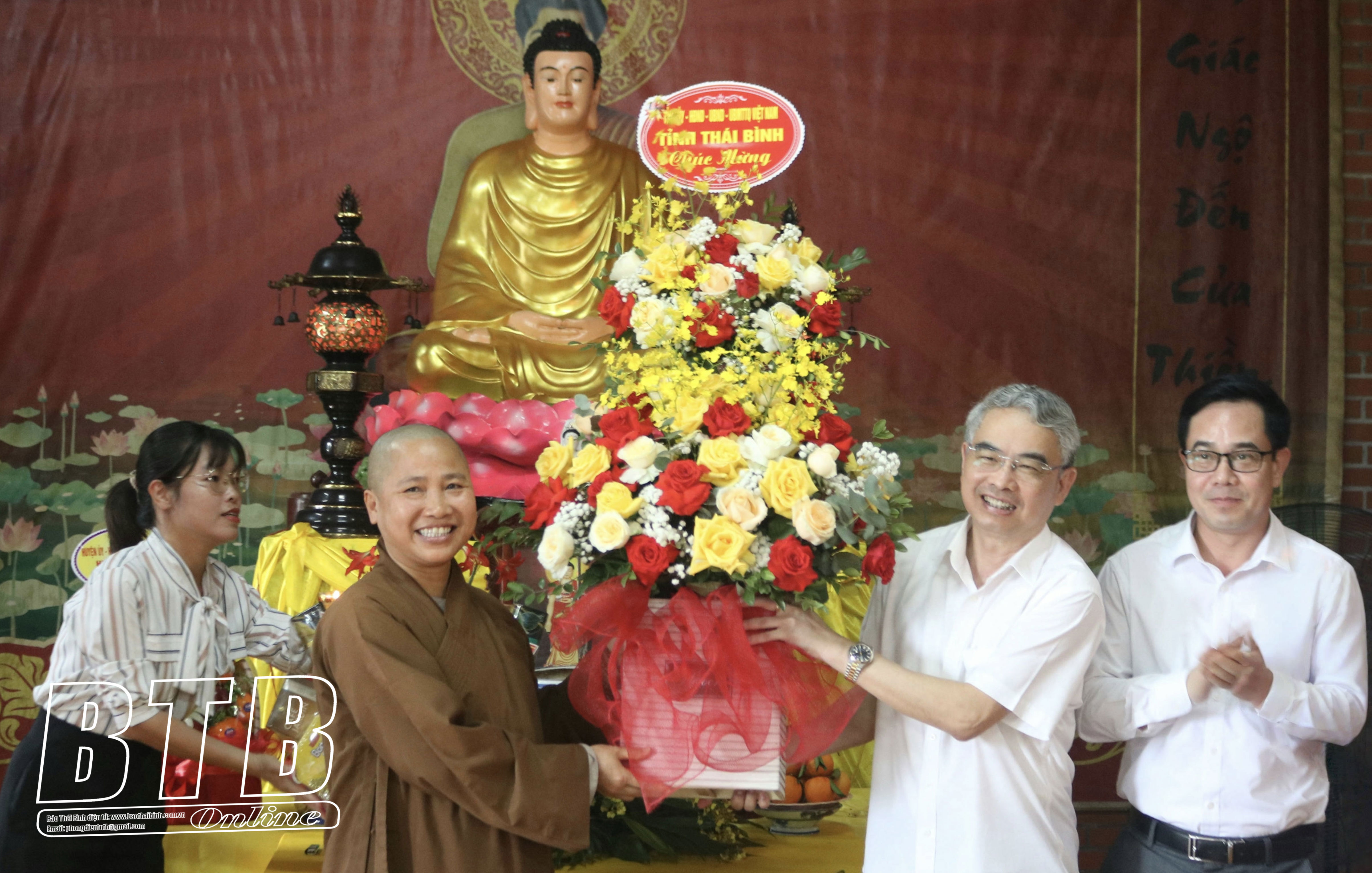 * Tại huyện Kiến XươngCác đồng chí: Phạm Đồng Thụy, Ủy viên Ban Thường vụ Tỉnh ủy, Trưởng ban Tuyên giáo và Dân vận Tỉnh ủy; Nguyễn Văn Huy, Tỉnh uỷ viên, Phó Trưởng đoàn đại biểu Quốc hội chuyên trách tỉnh chúc mừng Ni sư Thích Đàm Lương, Ủy viên Thường trực Ban Trị sự Giáo hội Phật giáo Việt Nam tỉnh, Trưởng Phân ban Ni giới Ban Trị sự Giáo hội Phật giáo Việt Nam tỉnh, trụ trì chùa Thủy Vân, xã Minh Quang (Kiến Xương). Ảnh: Hà MyCác đồng chí: Phạm Đồng Thụy, Ủy viên Ban Thường vụ Tỉnh ủy, Trưởng ban Tuyên giáo và Dân vận Tỉnh ủy; Nguyễn Văn Huy, Tỉnh ủy viên, Phó Trưởng đoàn đại biểu Quốc hội chuyên trách tỉnh chúc mừng Đại đức Thích Thanh Tùng, Ủy viên Thường trực Ban Trị sự Giáo hội Phật giáo Việt Nam tỉnh, Trưởng ban Trị sự Giáo hội Phật giáo huyện Kiến Xương, trụ trì chùa Bảo Trai, xã Vũ Quý (Kiến Xương). Ảnh: Hà My