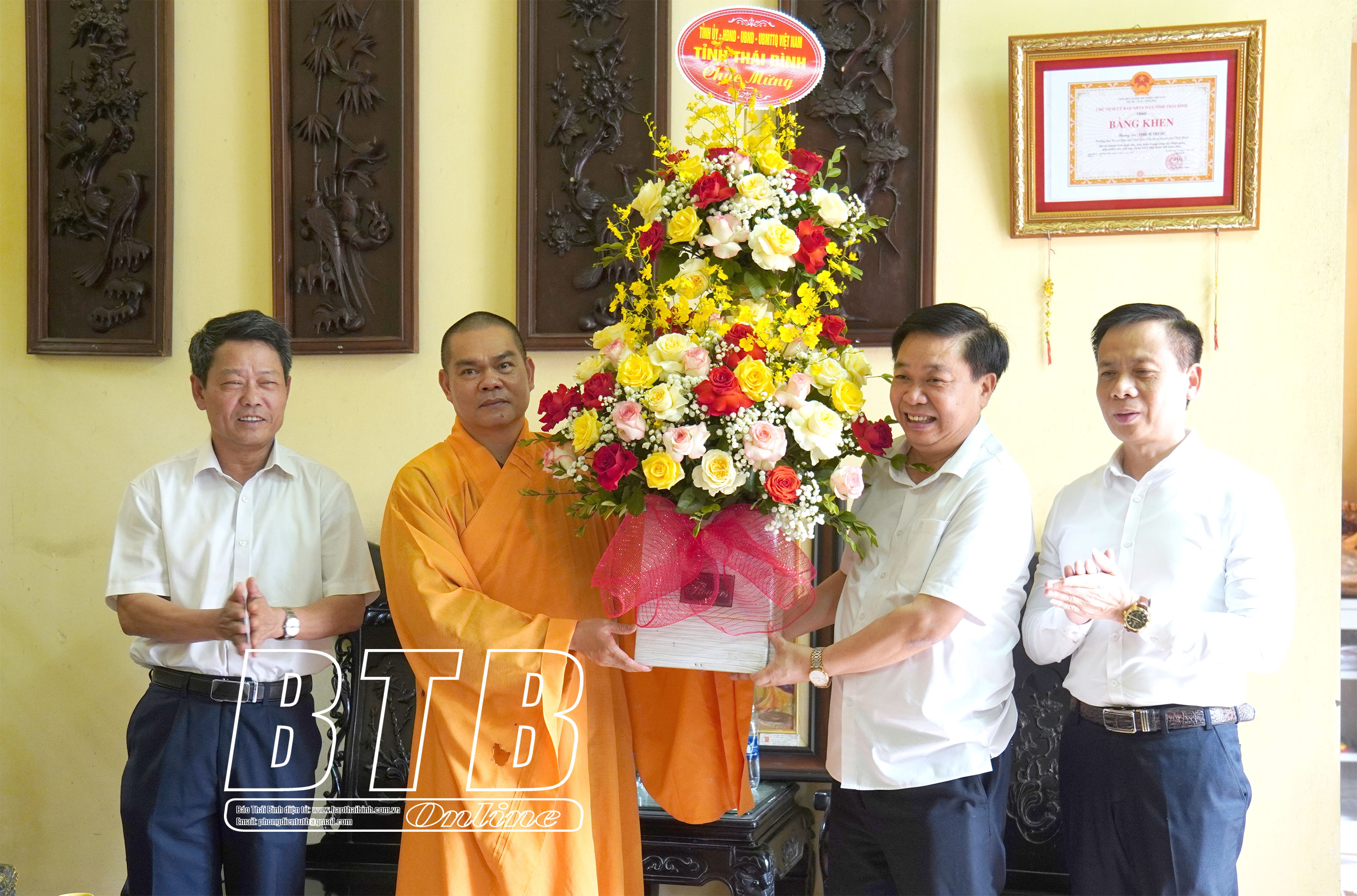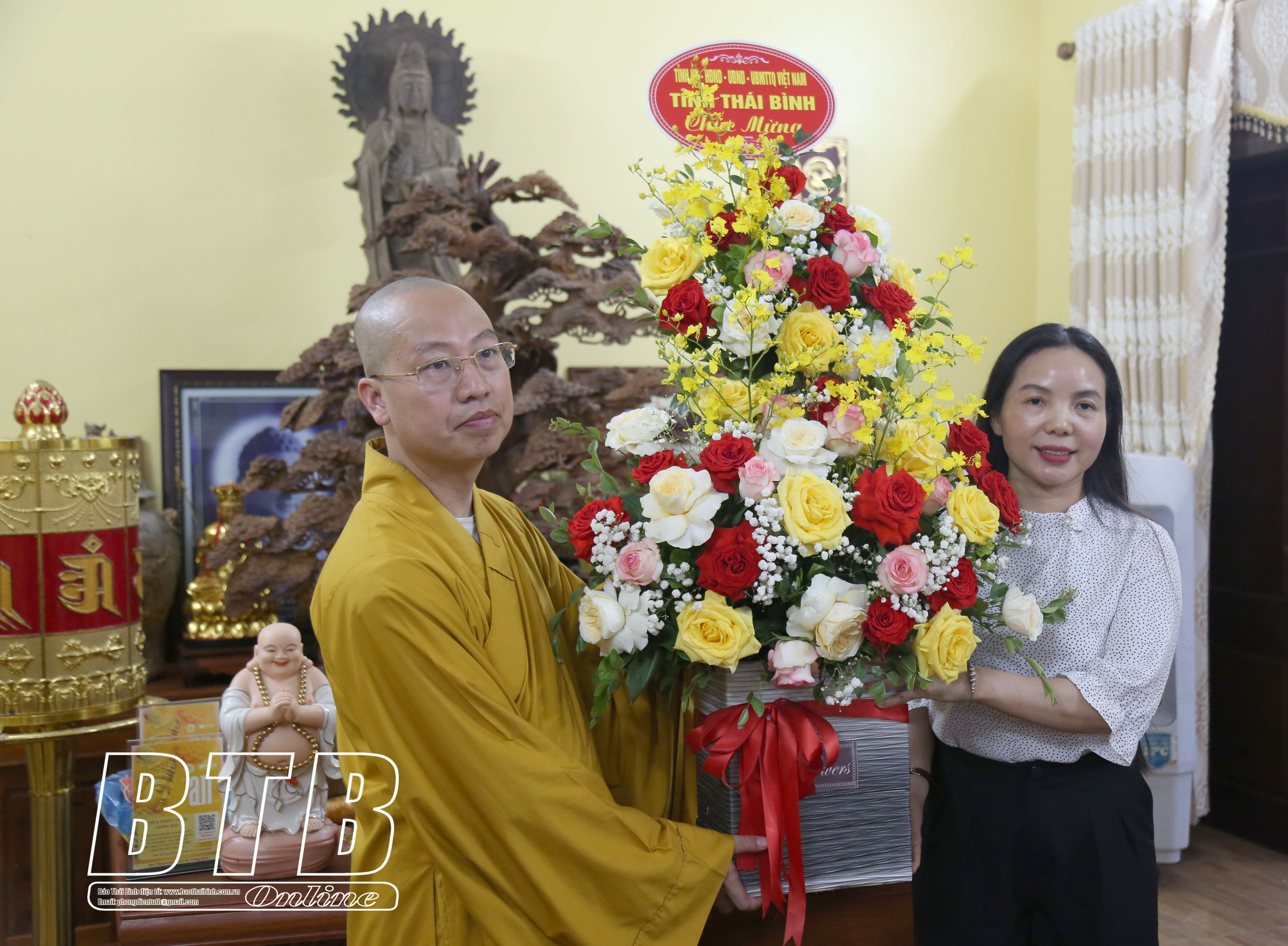 Đồng chí Đặng Thanh Giang, Ủy viên Ban Thường vụ Tỉnh ủy, Phó Chủ tịch thường trực HĐND tỉnh; lãnh đạo Ban Tuyên giáo và Dân vận Tỉnh ủy tặng hoa chúc mừng Đại đức Thích Thanh Lâm, Phó Trưởng ban Trị sự Giáo hội Phật giáo Việt nam huyện Vũ Thư, trụ trì chùa Thẫm, thị trấn Vũ Thư. Ảnh: Quỳnh Lưu
