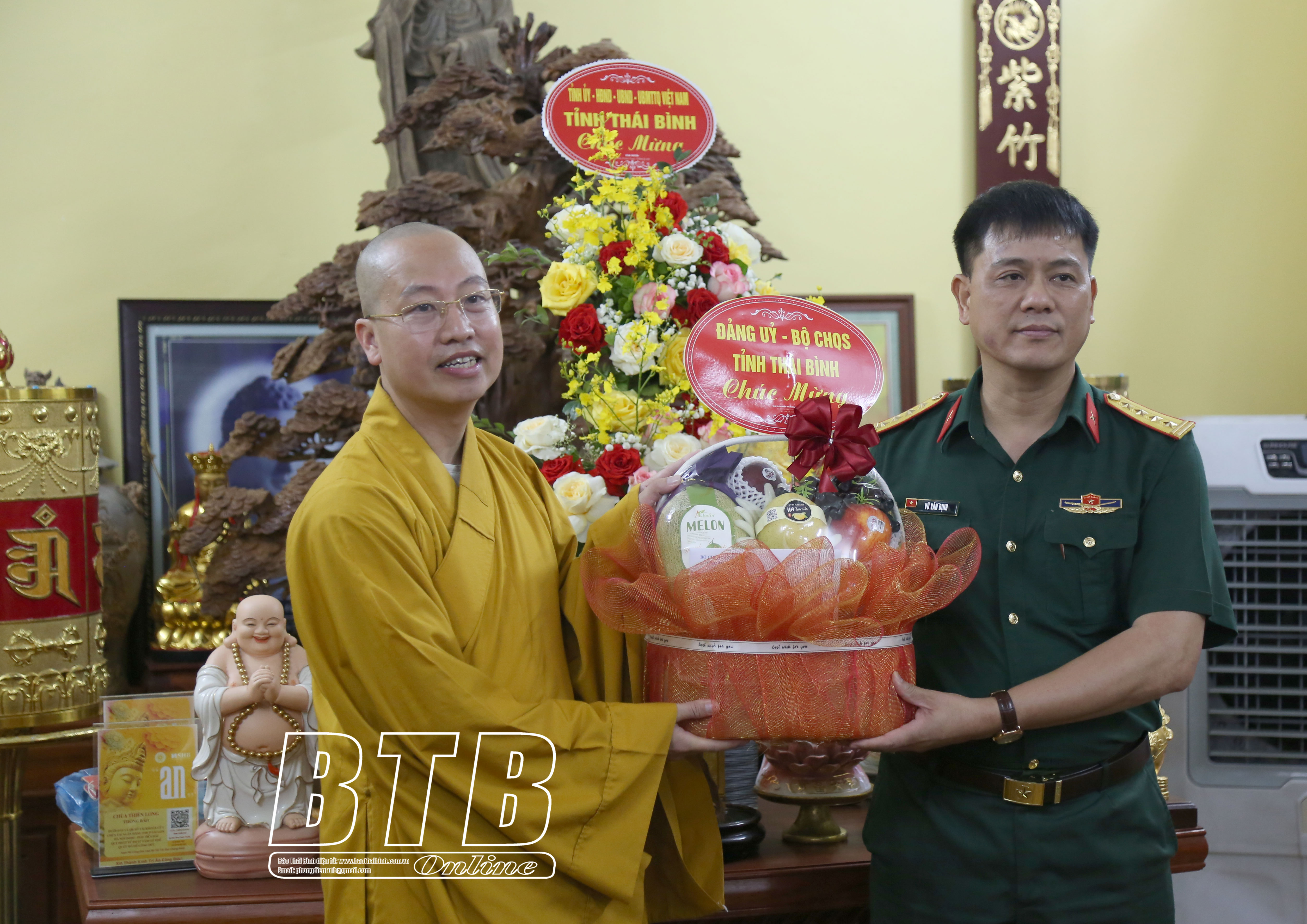 Đồng chí Đặng Thanh Giang, Ủy viên Ban Thường vụ Tỉnh ủy, Phó Chủ tịch thường trực HĐND tỉnh thăm và tặng hoa chúc mừng Đại đức Thích Minh Thành, Trưởng ban Trị sự Giáo hội Phật giáo Việt Nam huyện Vũ Thư, trụ trì chùa Khánh Sơn, xã Vũ Vinh. Ảnh: Quỳnh Lưu