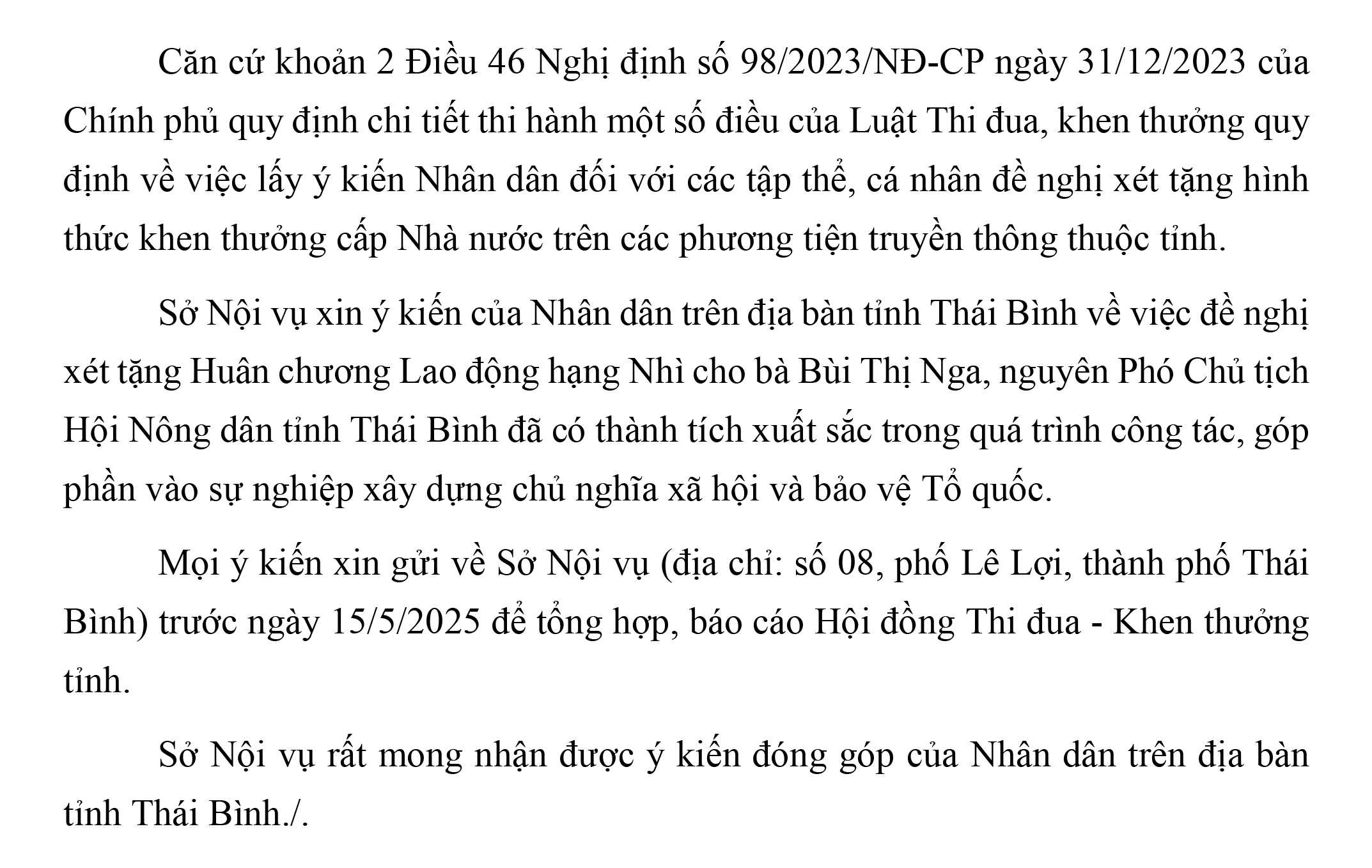 - Lấy ý kiến nhân dân đối với các tập thể, cá nhân đề nghị xét tặng danh hiệu “Anh hùng Lao động”, Huân chương các loại, các hạng 06.03.2024 | 11:06 AM