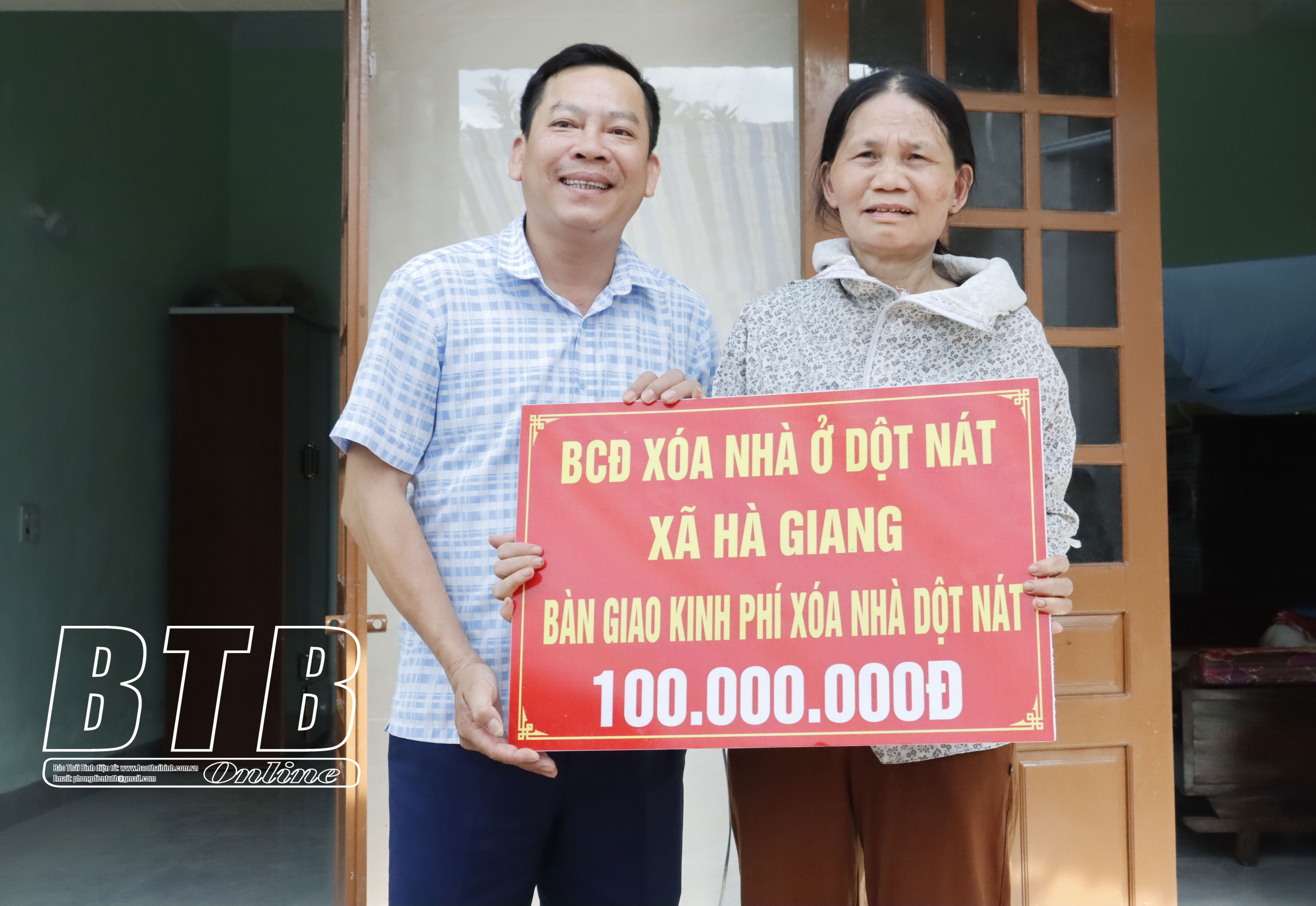 Lãnh đạo xã Hà Giang trao kinh phí của huyện hỗ trợ xóa nhà tạm, nhà dột nát cho gia đình bà Hoàng Thị Hảo, xã Hà Giang.
