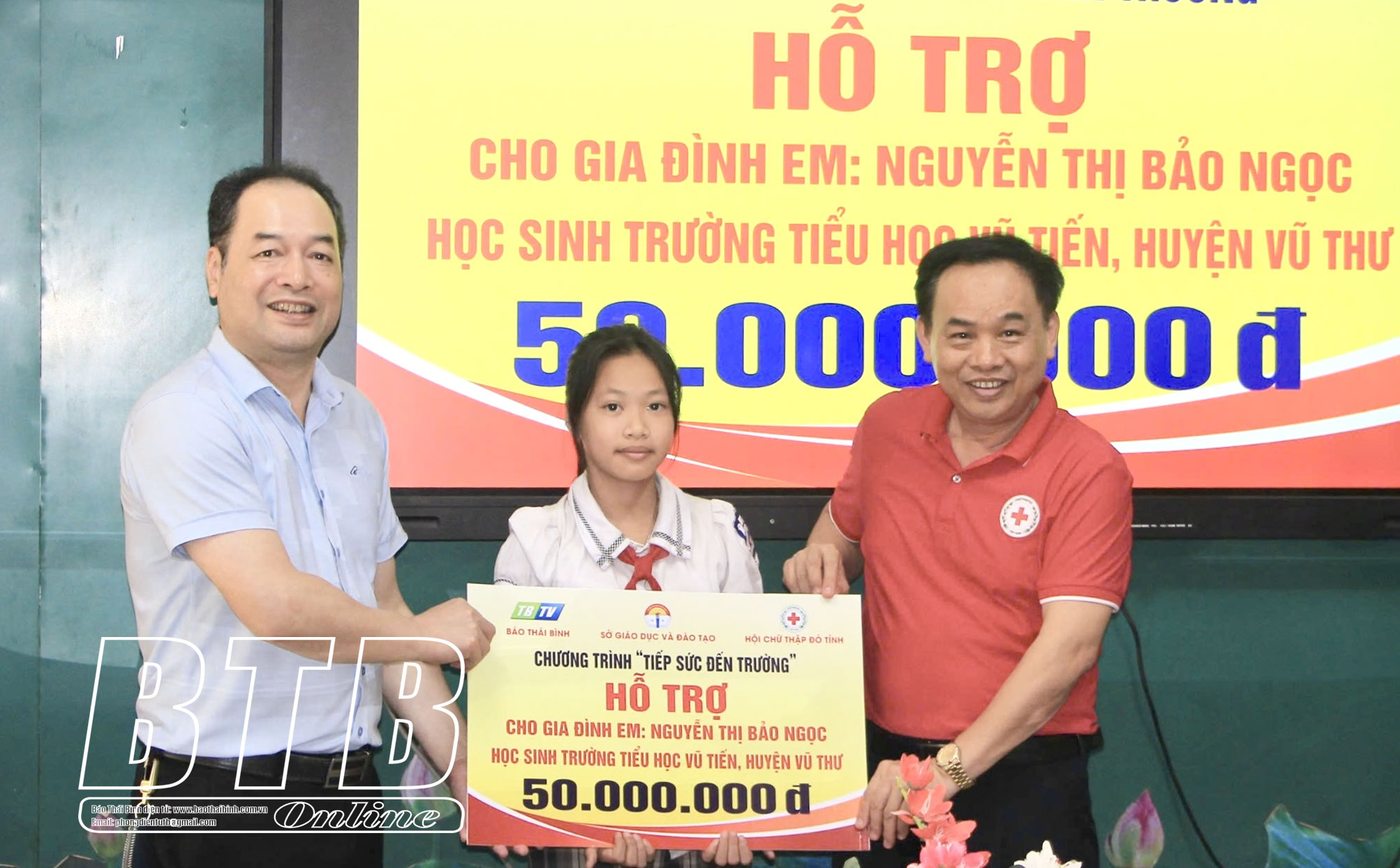 Cũng trong sáng ngày 17/5, đại diện chương trình “Tiếp sức đến trường” đã đến trao kinh phí hỗ trợ 50 triệu đồng trích từ quỹ “Tiếp sức đến trường” cho em Nguyễn Thị Bảo Ngọc, học sinh Trường Tiểu học Vũ Tiến (Vũ Thư).