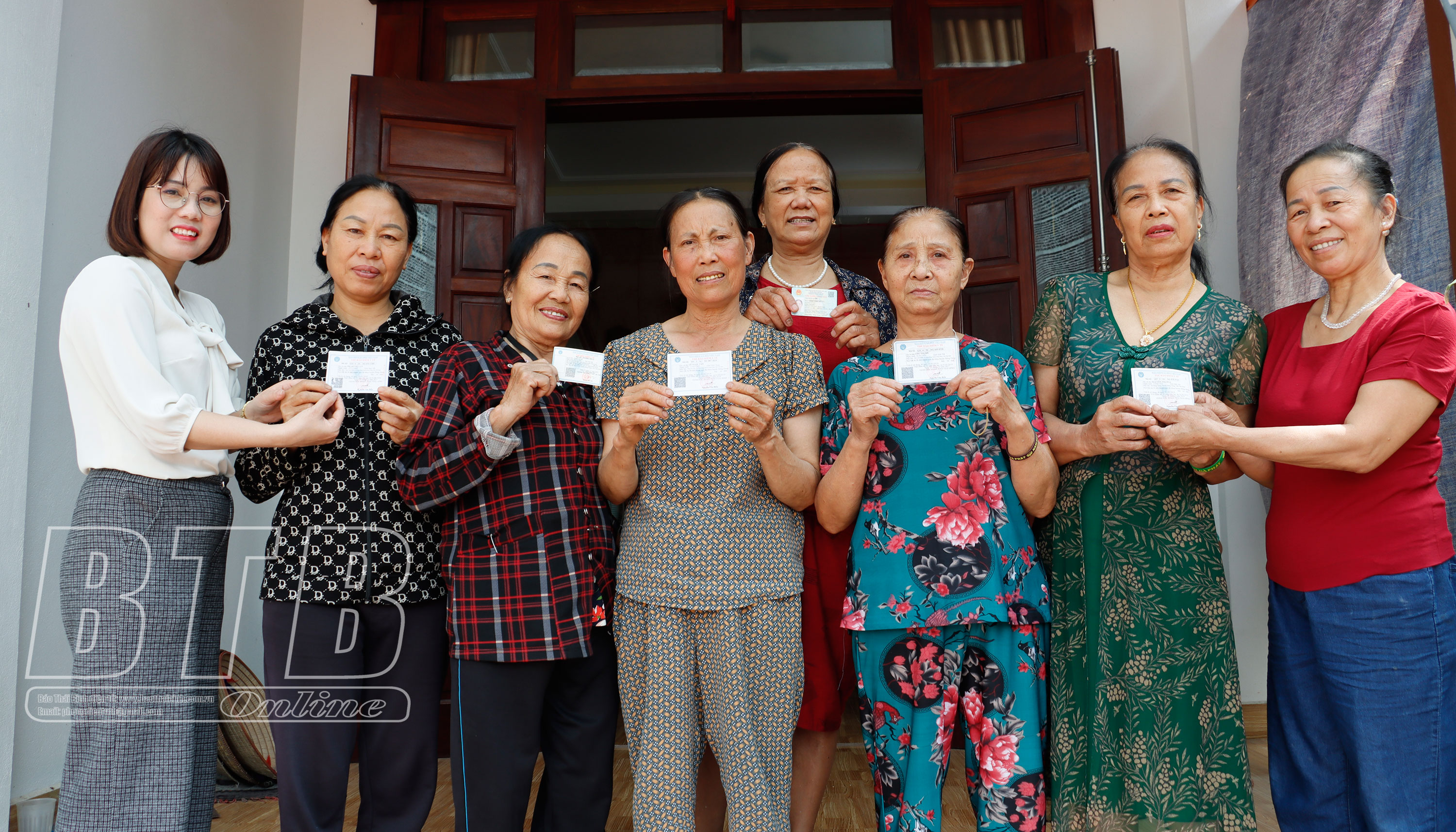 Các thành viên “Tổ, nhóm phụ nữ tiết kiệm giúp nhau mua BHYT” thôn Bến Hòa, xã Xuân Quang Động (Đông Hưng) nhận thẻ BHYT đợt tháng 5/2025.