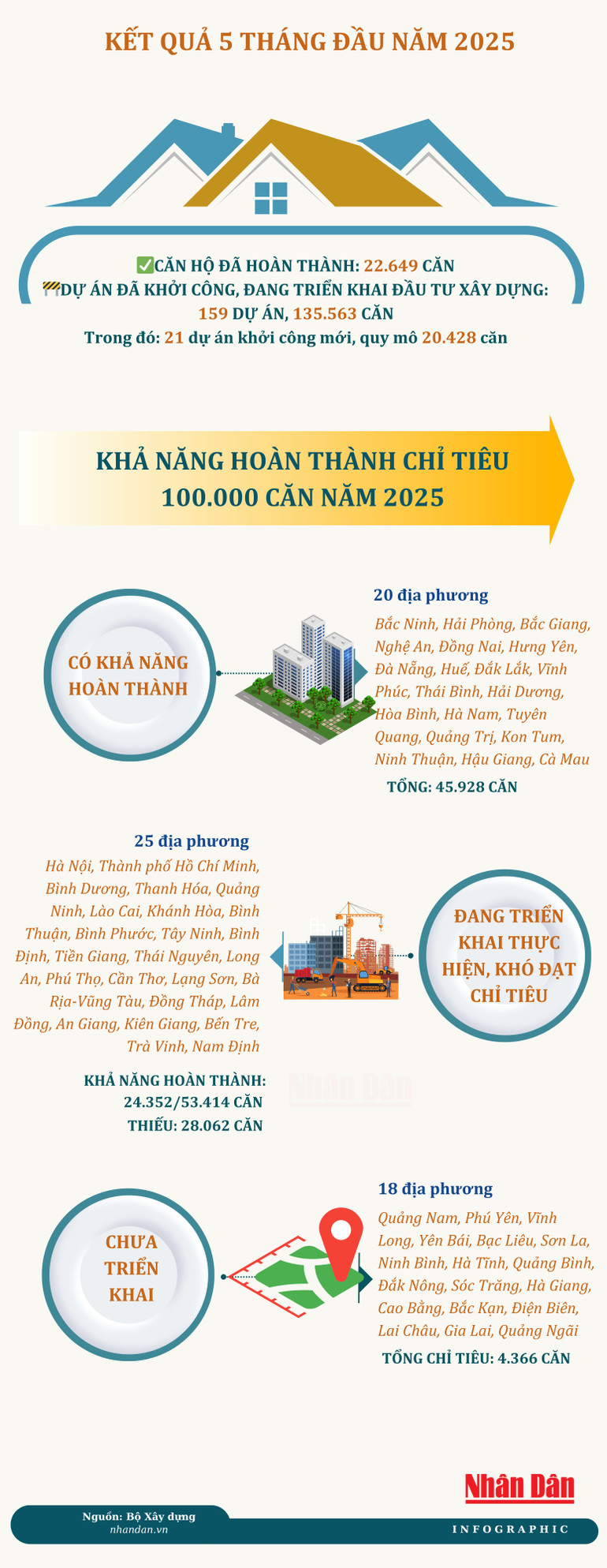 Trong 5 tháng đầu năm 2025, có 22.649 căn hộ nhà ở xã hội đã hoàn thành. Trên cả nước đã khởi công, đang triển khai đầu tư xây dựng 159 dự án với quy mô 135.563 căn nhà ở xã hội.