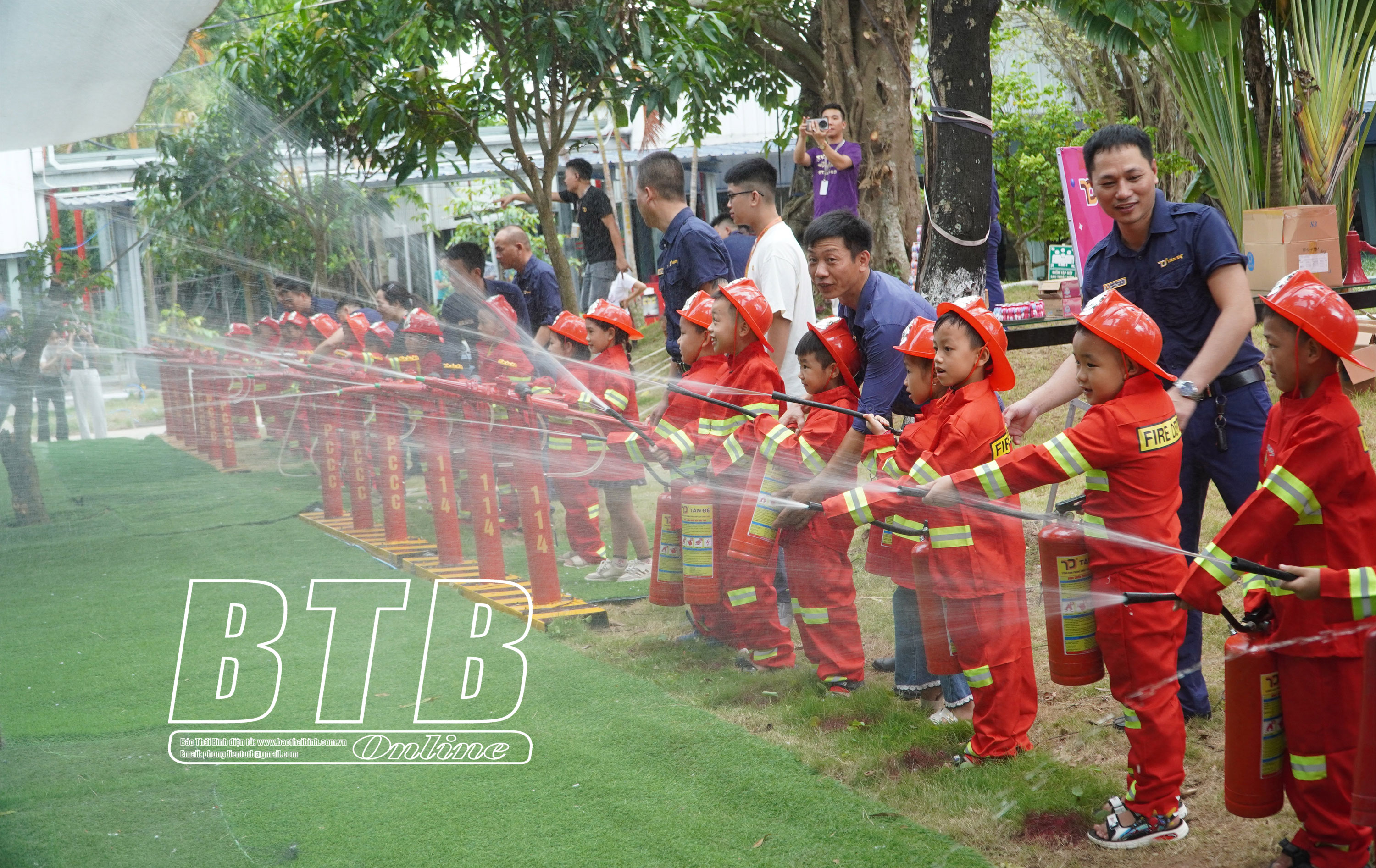 Các em nhỏ được trải nghiệm công việc của người lính cứu hỏa.