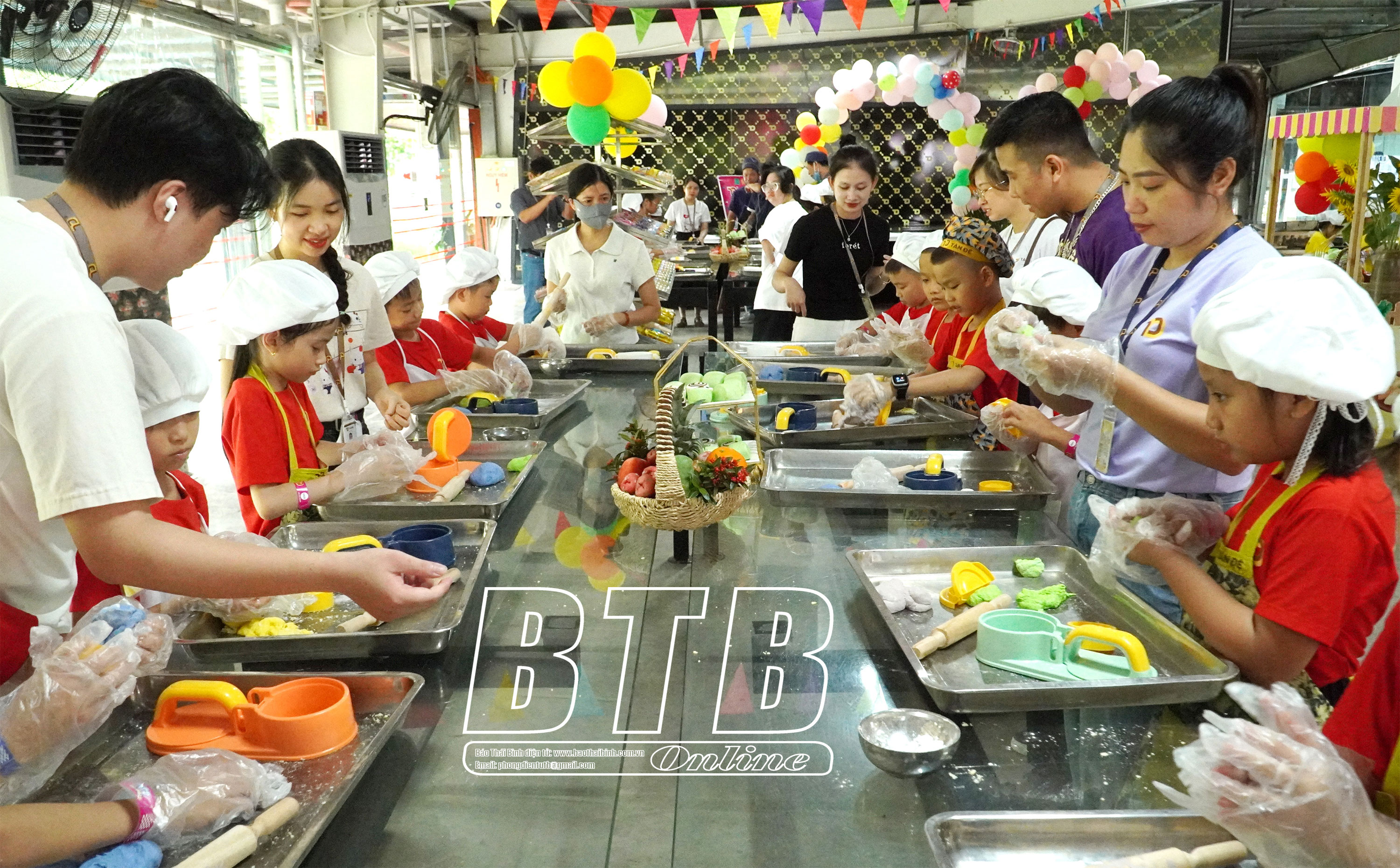 Các cán bộ, công nhân Công ty Tân Đệ cùng các tình nguyện viên hướng dẫn các em nhỏ tập làm đầu bếp.