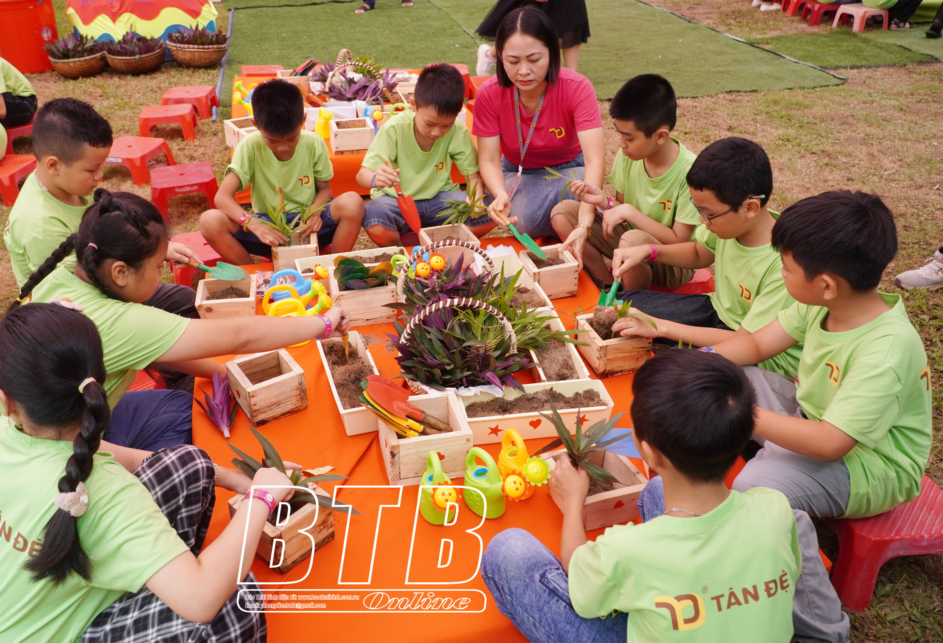 Các em nhỏ trải nghiệm công việc làm vườn, trồng cây xanh bảo vệ môi trường.