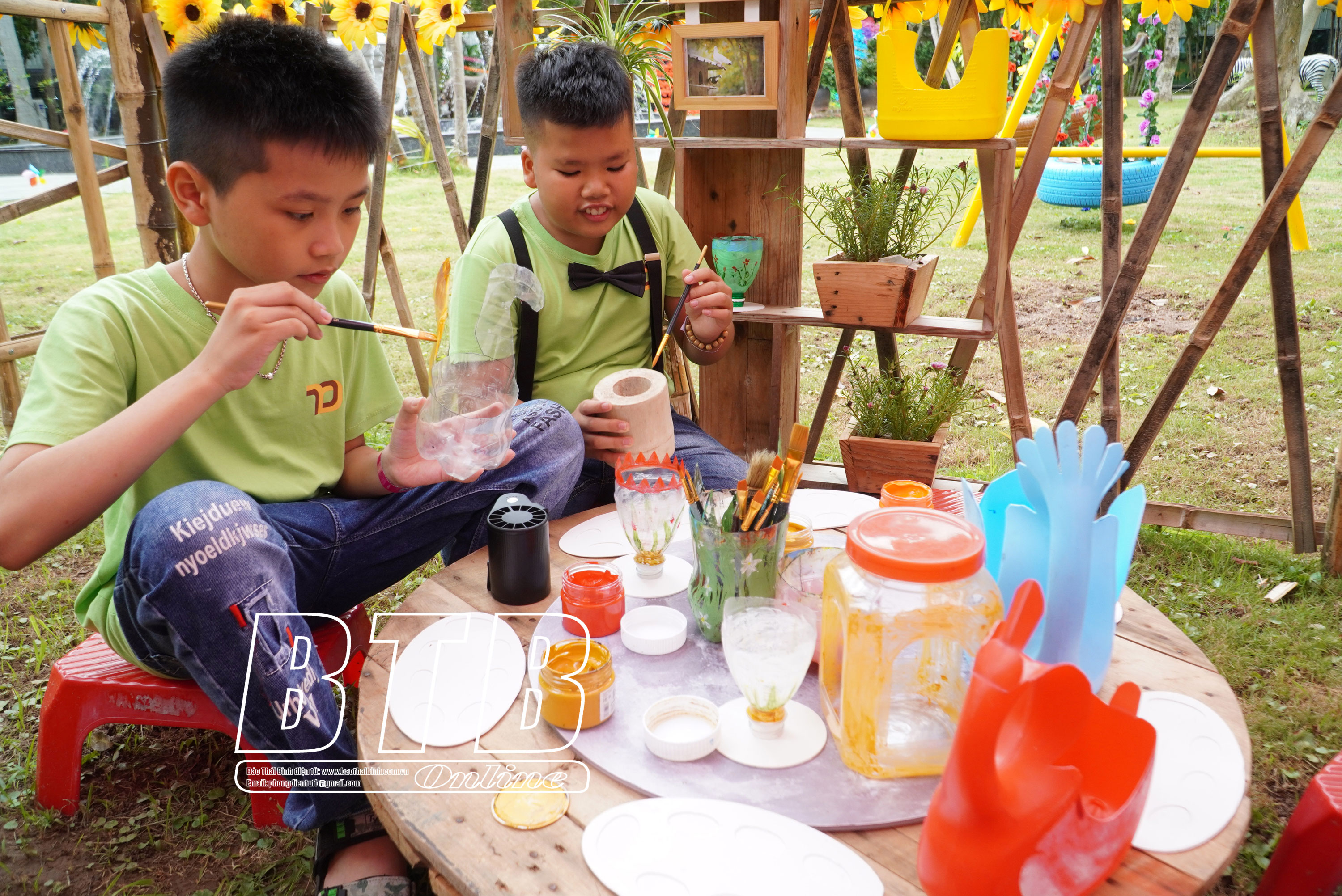 Các em tham gia hoạt động tái chế rác thải nhựa và vải vụn.