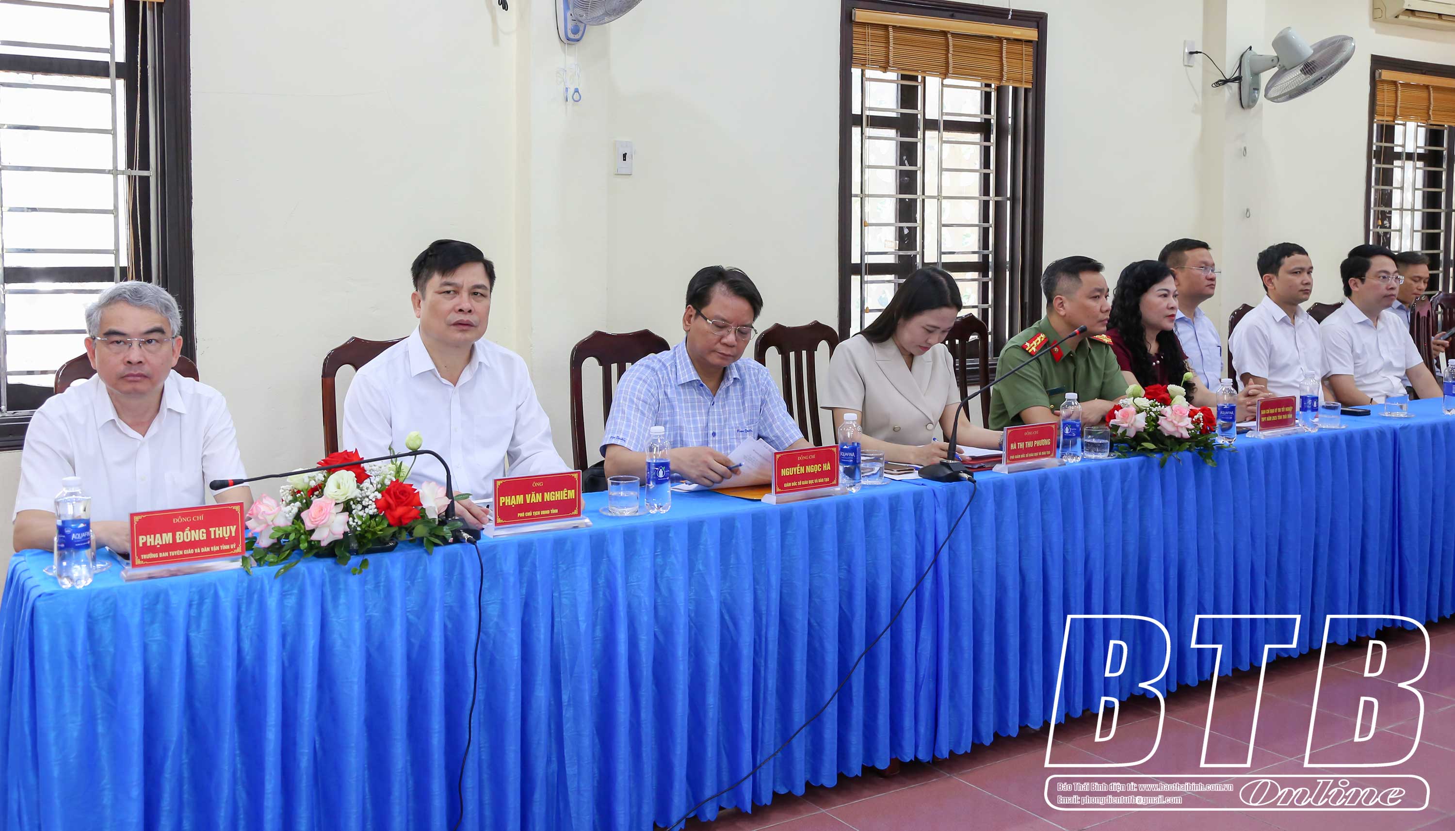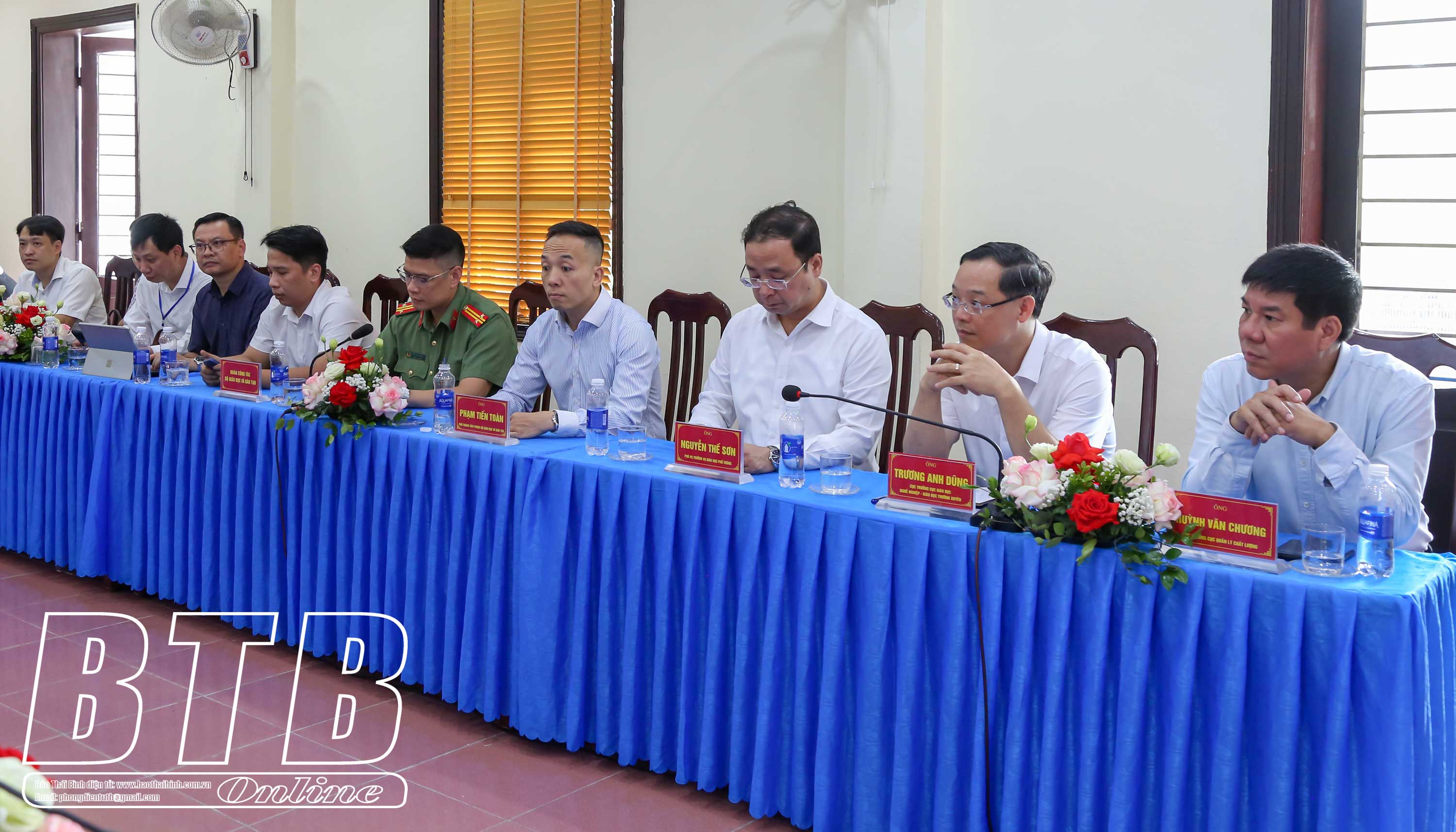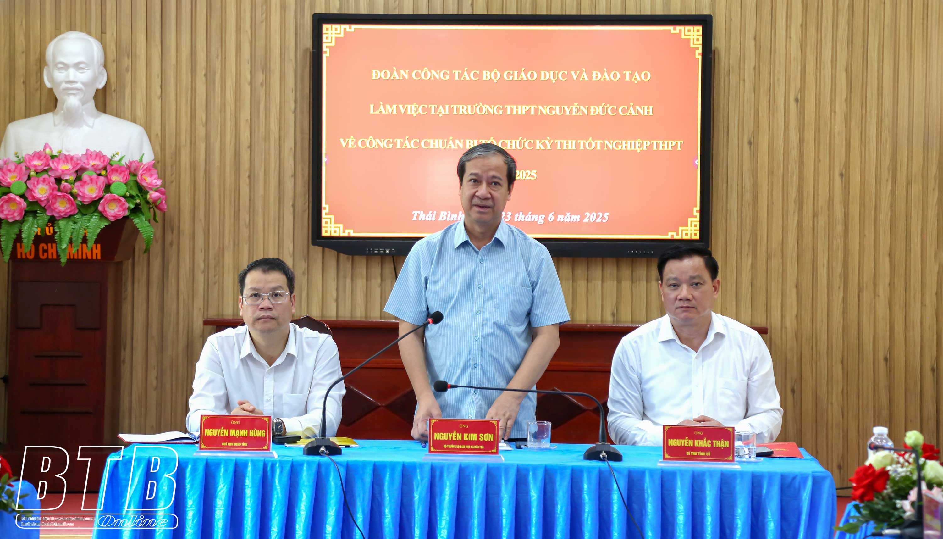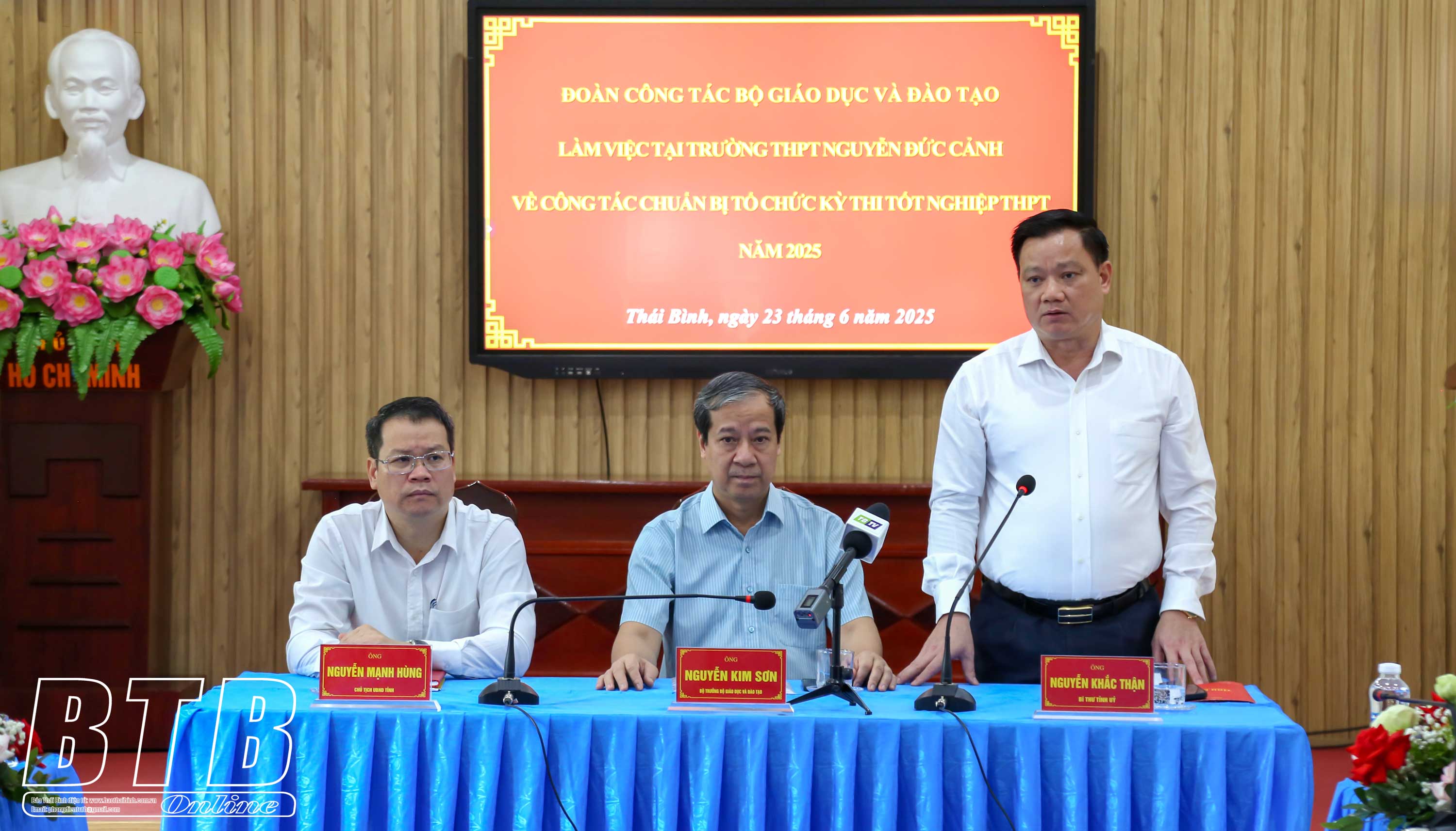 Đồng chí Nguyễn Khắc Thận, Bí thư Tỉnh ủy phát biểu khẳng định: Thời gian qua tỉnh Thái Bình tập trung triển khai các công việc để tiến tới hợp nhất tỉnh Hưng Yên và Thái Bình cũng như vận hành chính quyền địa phương 2 cấp đi vào hoạt động từ ngày 1/7 tới. Song song với các nhiệm vụ đó, tỉnh tập trung quyết liệt các giải pháp phát triển kinh tế - xã hội và đã đạt được nhiều kết quả nổi bật. Đối với kỳ thi tốt nghiệp THPT năm 2025, tỉnh xác định đây là kỳ thi rất quan trọng nên đã tập trung lãnh đạo, chỉ đạo và chuẩn bị các điều kiện tốt nhất cho kỳ thi với phương châm bảo đảm kỳ thi diễn ra an toàn, đúng quy định và tuyệt đối không để xảy ra sai sót, bảo đảm các điều kiện tốt nhất cho thí sinh dự thi và cán bộ coi thi. Đồng chí Bí thư Tỉnh ủy mong muốn sẽ tiếp tục nhận được sự quan tâm, hỗ trợ của đồng chí Bộ trưởng và Bộ Giáo dục và Đào tạo đối với tỉnh trong tổ chức kỳ thi cũng như các nhiệm vụ liên quan đến lĩnh vực giáo dục và đào tạo trong thời gian tới.