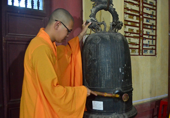 Thỉnh chuông vào thời khắc giao thừa tại chùa Kim Tân, thôn Tô Hồ, xã An Mỹ. Ảnh: Phương Chi