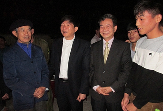 Các đồng chí lãnh đạo tỉnh, huyện Kiến Xương tới thăm các điểm biểu diễn văn nghệ phục vụ người dân. Ảnh: Thanh Huyền