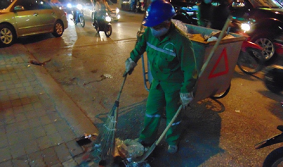 Đêm giao thừa, các công nhân vệ sinh môi trường vẫn miệt mài quét dọn đường phố sạch sẽ. Ảnh: Minh Nguyệt