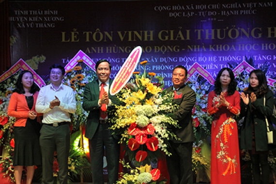 Đồng chí Nguyễn Hồng Diên, Ủy viên Trung ương Đảng, Phó Bí thư Tỉnh ủy, Chủ tịch UBND tỉnh tặng hoa chúc mừng Anh hùng Lao động - Nhà khoa học Hoàng Đức Thảo.