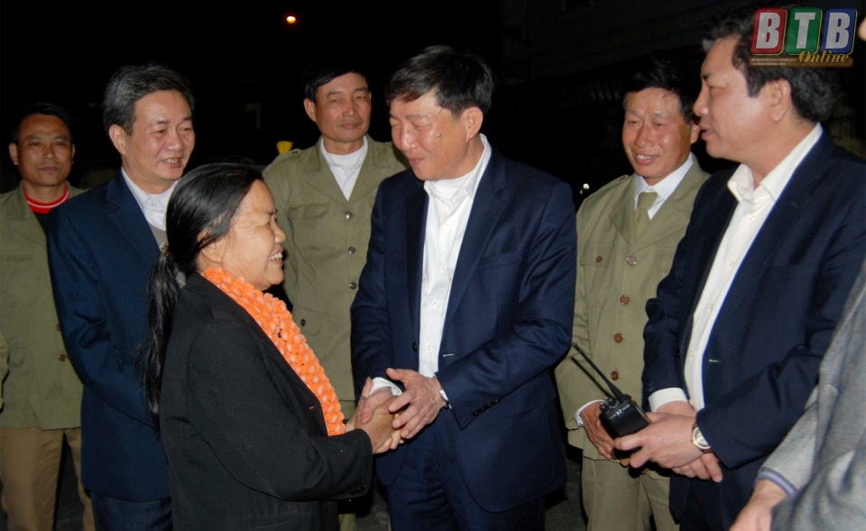 Các đồng chí lãnh đạo tỉnh và huyện Kiến Xương chúc tết, động viên tổ công tác bảo đảm an ninh trật tự, phòng, chống đốt pháo trong đêm giao thừa tại khu Quang Trung, thị trấn Thanh Nê. Ảnh: Khắc Duẩn.