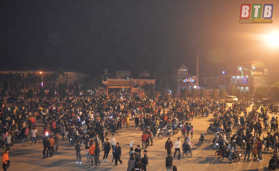 Trên các ngả đường nhộn nhịp đông vui, hàng nghìn người tấp nập đổ về Trung tâm hội nghị huyện xem màn bắn pháo hoa đêm giao thừa.