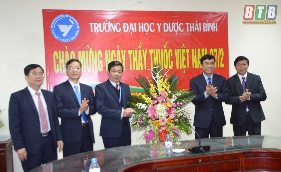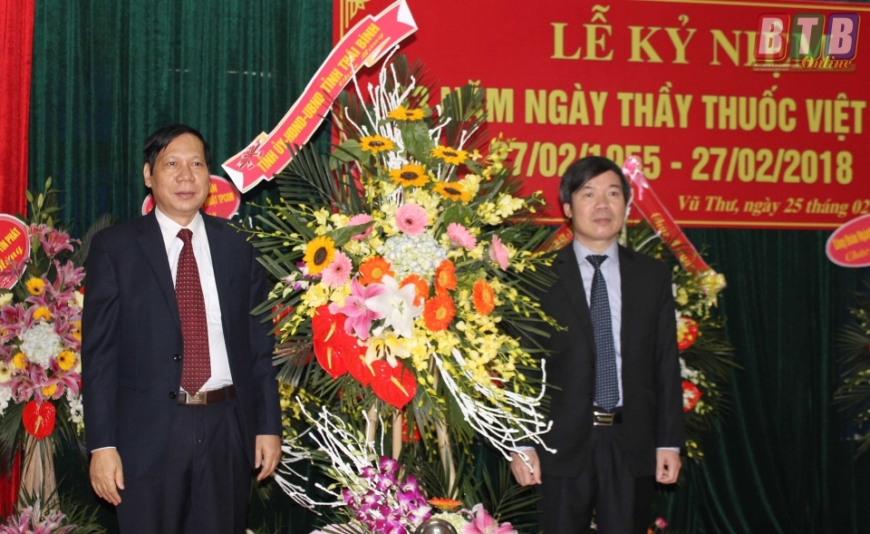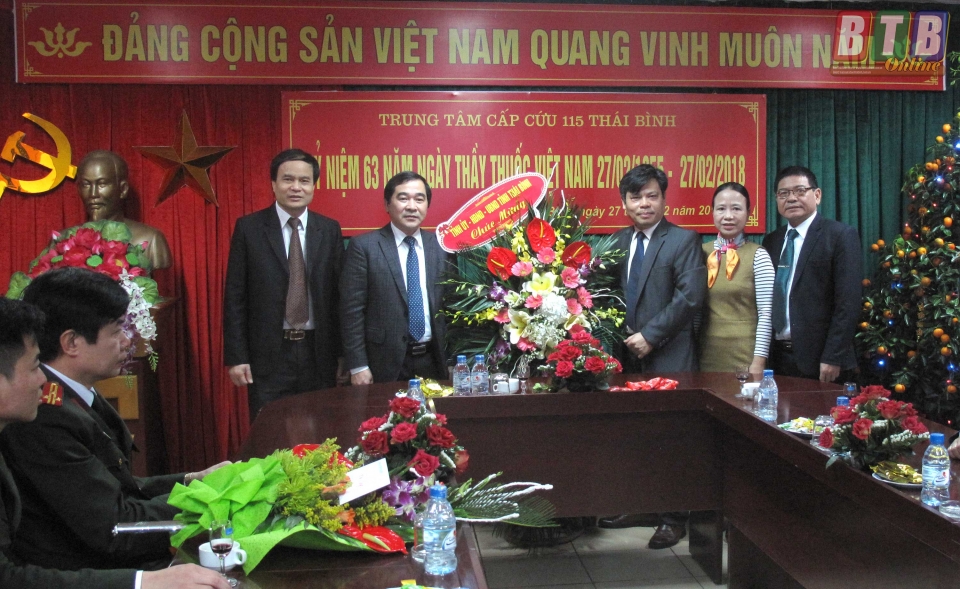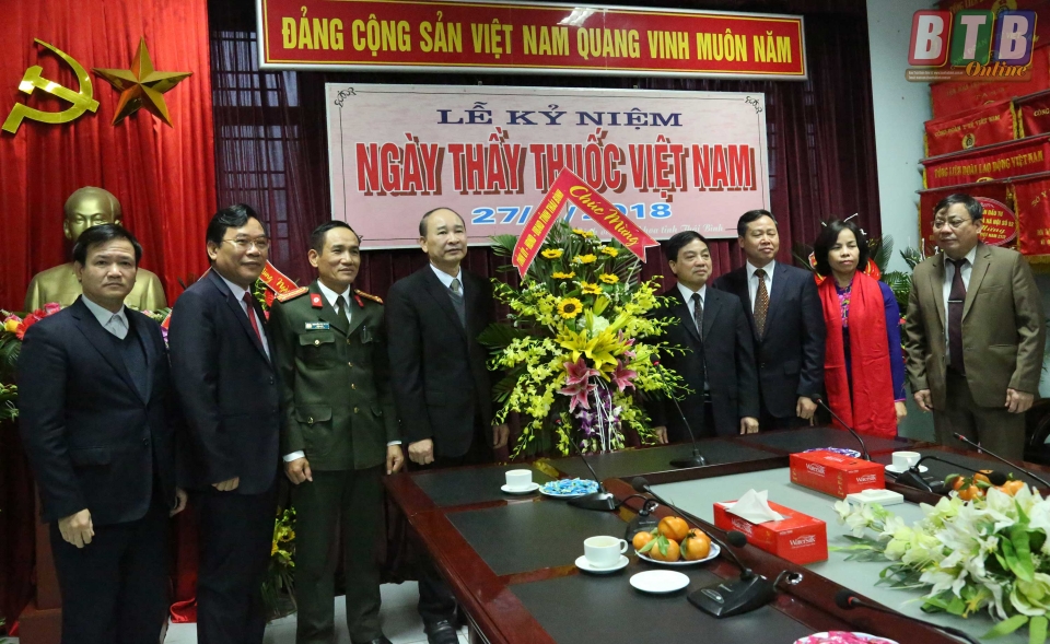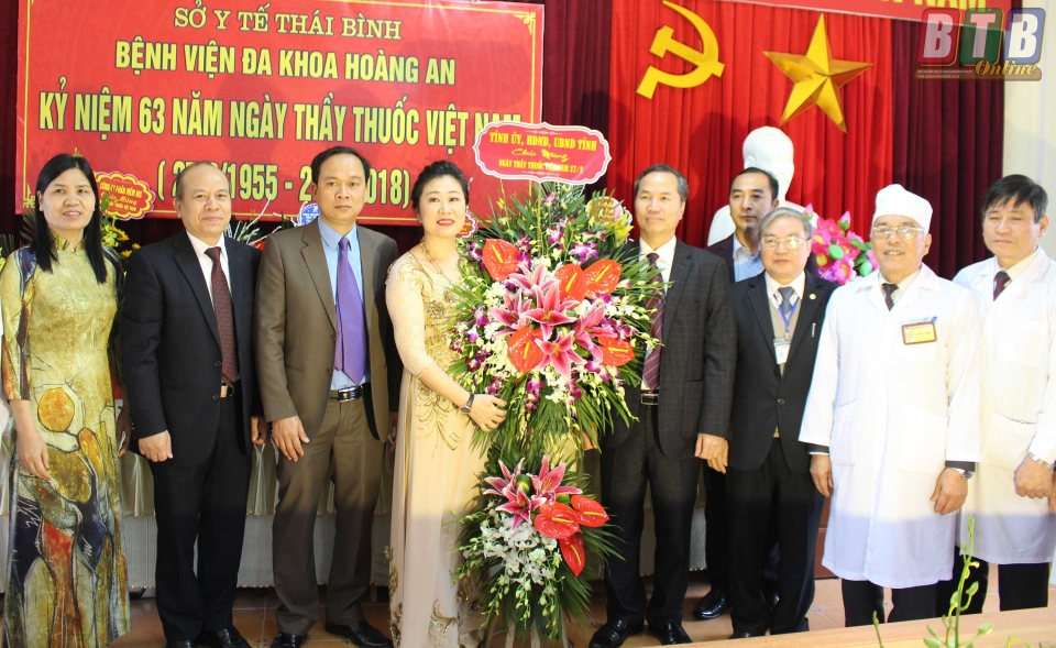 * Các đồng chí: Đàm Văn Vượng, Ủy viên Ban Thường vụ Tỉnh ủy, Phó Chủ tịch thường trực HĐND tỉnh; Nguyễn Hồng Chuyên, Ủy viên Ban Thường vụ, Trưởng ban Tuyên giáo Tỉnh ủy; Hà Công Toàn, Ủy viên Ban Thường vụ, Chủ nhiệm Ủy ban Kiểm tra Tỉnh ủy; Nguyễn Tiến Thành, Ủy viên Ban Thường vụ, Trưởng ban Dân vận Tỉnh ủy; Vũ Mạnh Hiền, Tỉnh ủy viên, Phó Chủ tịch HĐND tỉnh; Nguyễn Thị Lĩnh, Tỉnh ủy viên, Phó Chủ tịch UBND tỉnh; Phạm Văn Xuyên, Tỉnh ủy viên, Phó Chủ tịch UBND tỉnh; Nguyễn Hoàng Giang, Tỉnh ủy viên, Phó Chủ tịch UBND tỉnh đã đến thăm, chúc mừng đội ngũ thầy thuốc, cán bộ y tế Bệnh viện Đa khoa Hoàng An, Bệnh viện Mắt; Bệnh viện Y học cổ truyền, Bệnh viện Tâm thần; Bệnh viện Phổi; Trung tâm phòng chống HIV/AIDS, Trung tâm Chăm sóc sức khỏe sinh sản; Trung tâm Cấp cứu 115, Bệnh viện Phụ sản; Bệnh viện Đa khoa Vũ Thư; Trung tâm Da liễu, Trung tâm Kiểm nghiệm thuốc mỹ phẩm thực phẩm; Bệnh viện Phục hồi chức năng; Trung tâm Y tế dự phòng tỉnh.