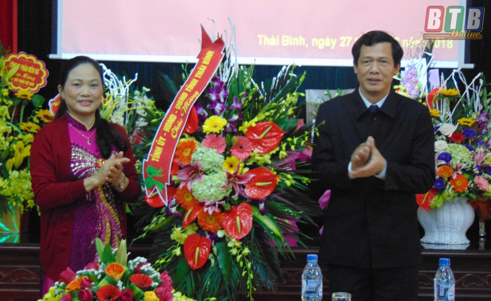 Đồng chí Đặng Trọng Thăng, Phó Bí thư thường trực Tỉnh ủy, Chủ tịch HĐND tỉnh tặng hoa chúc mừng đội ngũ nhà giáo, thầy thuốc Trường Đại học Y Dược Thái Bình. Ảnh: Nguyễn Cường
