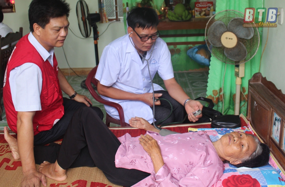 Bác sĩ Trạm Y tế xã Đông Tân khám sức khỏe cho mẹ Việt Nam anh hùng Phạm Thị Chít, thôn Vĩnh Ninh, xã Đông Tân.