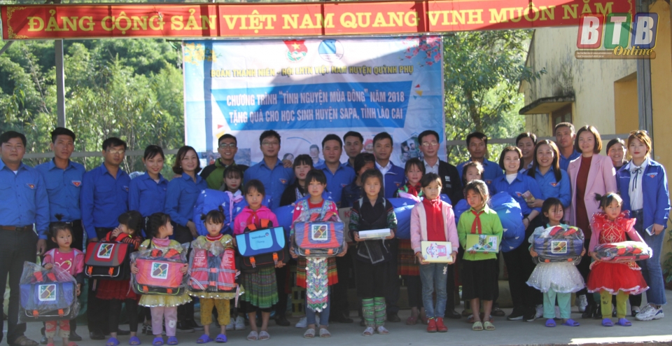 Gần 30 tình nguyện viên là cán bộ Huyện đoàn, các đoàn xã, thị trấn và một số đơn vị trong huyện Quỳnh Phụ đã tới thăm và trao các suất quà gồm chăn bông, quần áo ấm, gạo, nhu yếu phẩm… với tổng trị giá gần 60 triệu đồng cho học sinh đang học tập tại các điểm trường Móng Sến 2 – Trường Phổ thông dân tộc bán trú Tiểu học Trung Chải; điểm trường mầm non Bản Khoang; điểm trường Phổ thông dân tộc bán trú THCS Bản Khoang. Đây là những điểm trường xa trung tâm, giao thông khó khăn, điều kiện cơ sở vật chất còn nhiều thiếu thốn.
