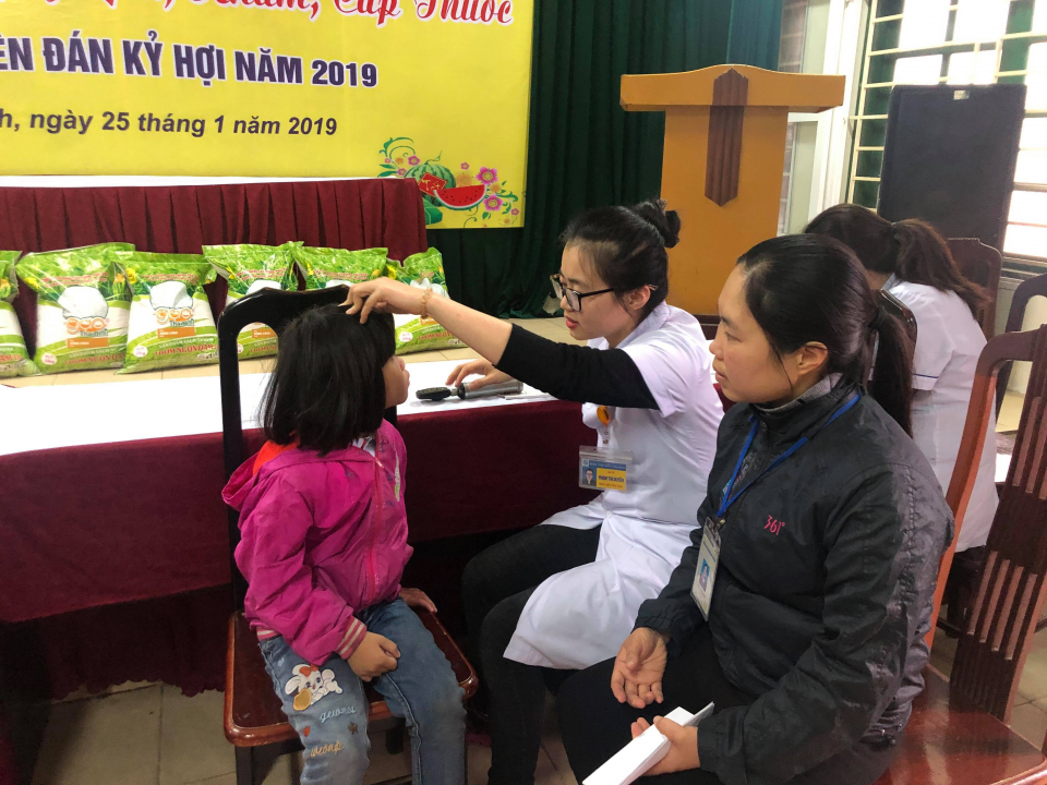 Các bác sĩ Bệnh viện Mắt Thái Bình khám bệnh cho các em học sinh.