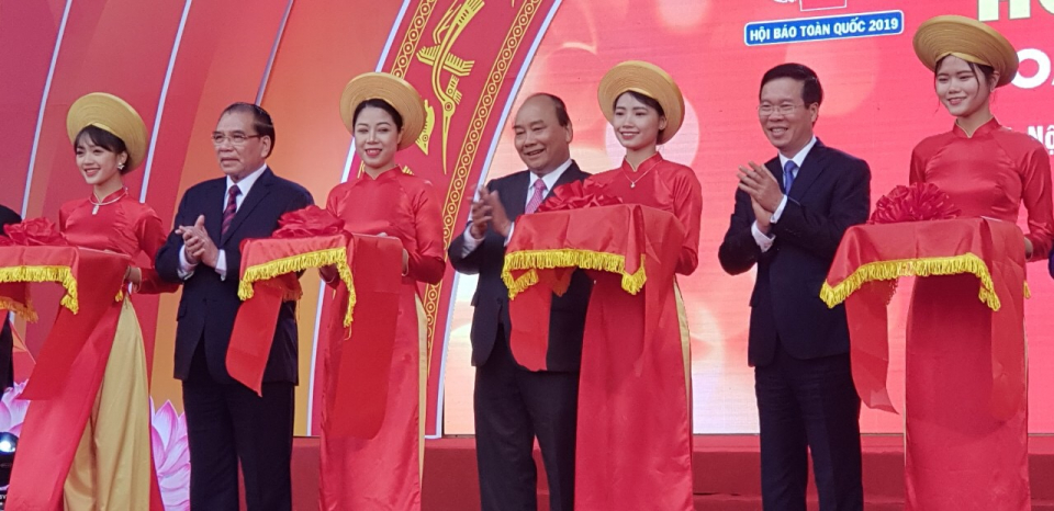 Các đồng chí lãnh đạo, nguyên lãnh đạo Đảng, Nhà nước; lãnh đạo Hội Nhà báo Việt Nam cắt băng khai mạc Hội báo toàn quốc năm 2019. Ảnh: VAT