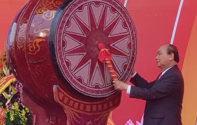 Đồng chí Nguyễn Xuân Phúc, Uỷ viên Bộ Chính trị, Thủ tướng Chính phủ đánh trống khai hội. Ảnh: VAT