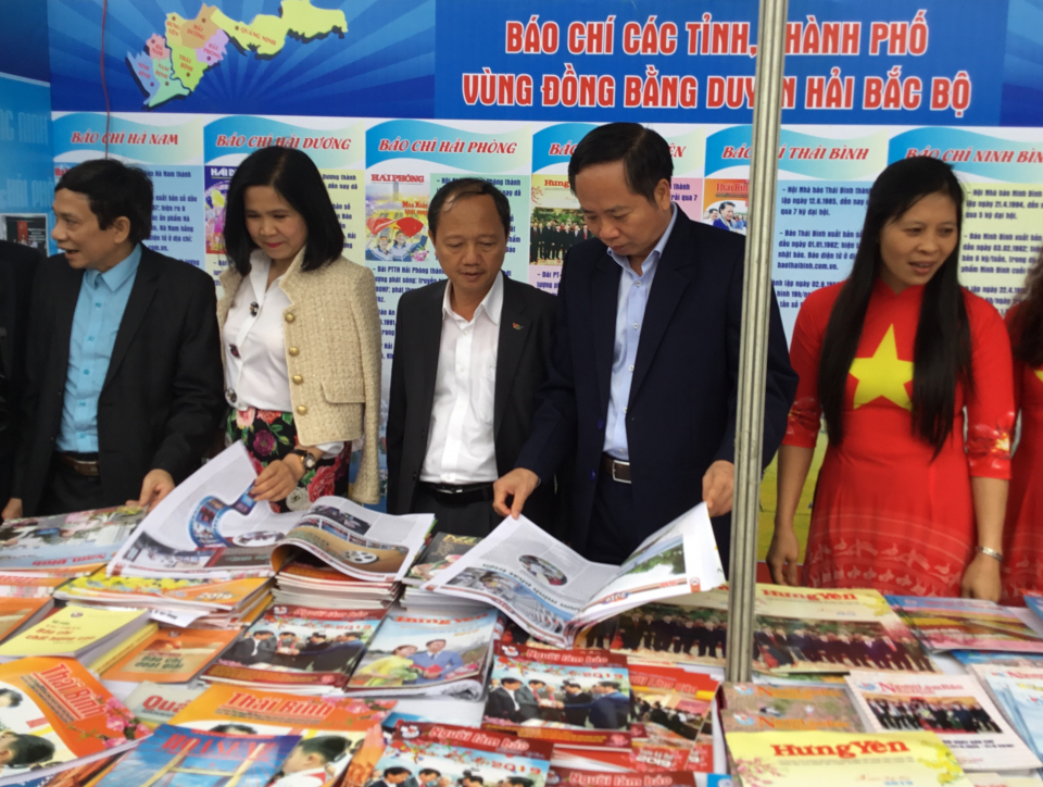 Các đại biểu tham quan gian trưng bày báo chí các tỉnh, thành phố vùng đồng bằng duyên hải Bắc bộ. Ảnh: NAP