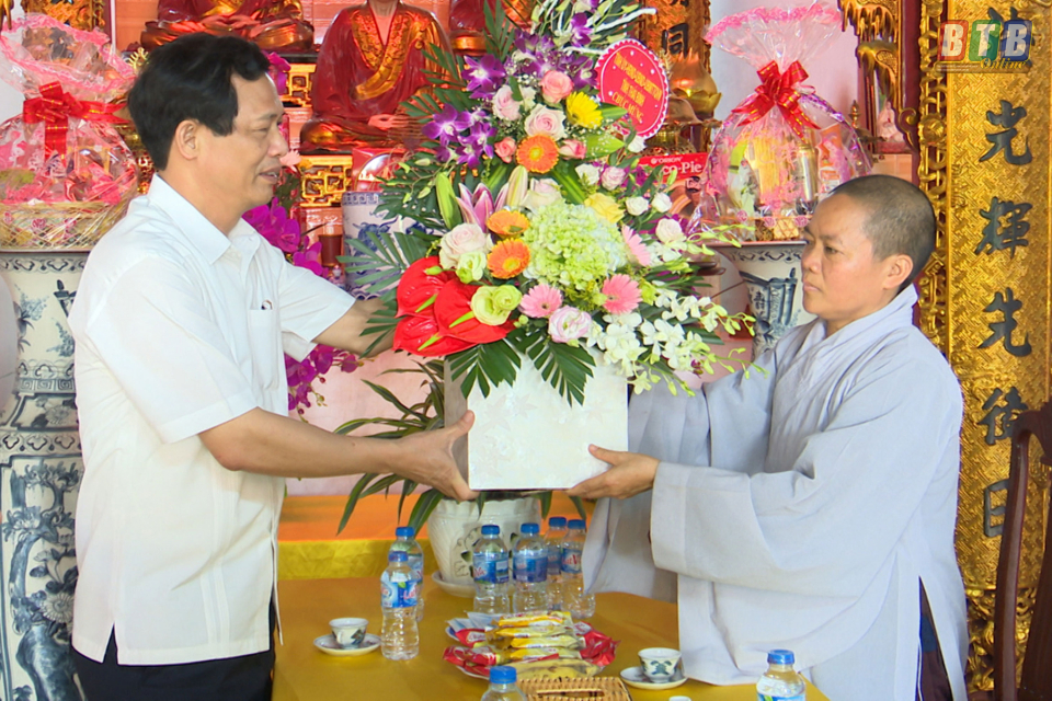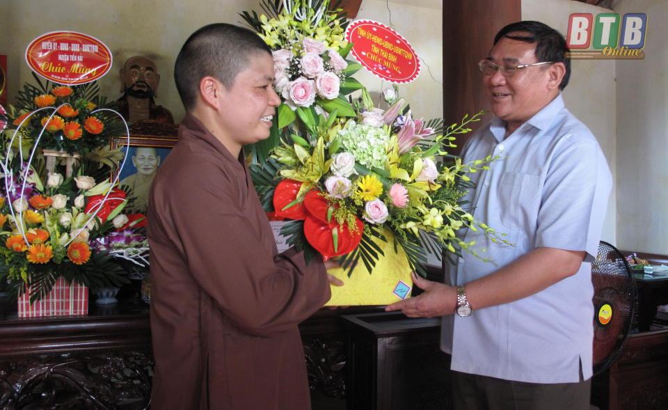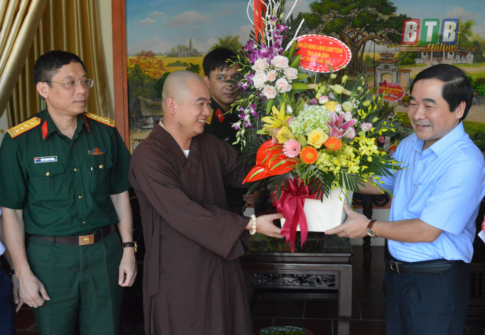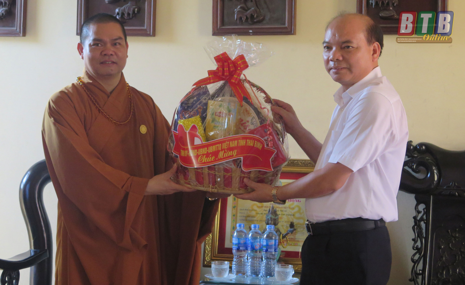 Đồng chí Đặng Thanh Giang, Ủy viên Ban Thường vụ Tỉnh ủy, Chủ tịch Ủy ban MTTQ Việt Nam tỉnh đến thăm, tặng quà, chúc mừng Thượng tọa Thích Thanh Định, Ủy viên Hội đồng Trị sự Giáo hội Phật giáo Việt Nam, Phó Trưởng ban thường trực Ban Trị sự Giáo hội Phật giáo Việt Nam tỉnh, trụ trì chùa Từ Xuyên (phường Hoàng Diệu); Thượng tọa Thích Trí Sử, Ủy viên thường trực Ban Trị sự Giáo hội Phật giáo Việt Nam tỉnh, Trưởng ban Trị sự Giáo hội Phật giáo Việt Nam thành phố Thái Bình, trụ trì chùa Sùng Nghiêm (phường Hoàng Diệu).