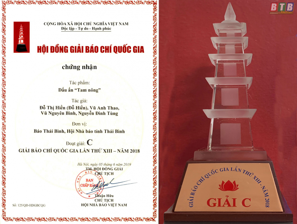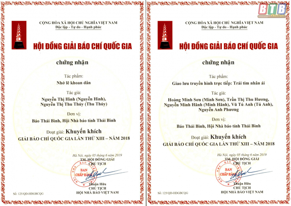 Năm nay Báo Thái Bình đạt 3 giải báo chí quốc gia gồm: 01 giải C với tác phẩm “Dấu ấn tam nông” của nhóm tác giả: Vũ Anh Thao, Vũ Nguyên Bình, Nguyễn Đình Tùng, Đỗ Thị Hiền (Đỗ Hiền); 2 giải Khuyến khích với tác phẩm “Giao lưu truyền hình trực tiếp: Trái tim nhân ái” của nhóm tác giả: Hoàng Minh Sơn (Minh Sơn), Nguyễn Minh Hãnh (Minh Hãnh), Vũ Tú Anh (Tú Anh), Trần Thị Thu Hương, Nguyễn Anh Phương và tác phẩm “Nhớ lẽ khoan dân” của nhóm tác giả: Nguyễn Thị Hình (Nguyễn Hình), Nguyễn Thị Thu Thủy (Thu Thủy). Đây là năm thứ 4 Báo Thái Bình đạt Giải báo chí quốc gia.