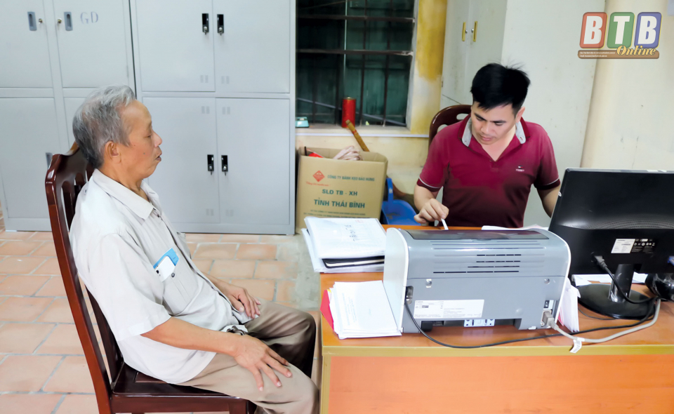 Cán bộ lao động - thương binh và xã hội xã Bách Thuận (Vũ Thư) tư vấn thủ tục bảo hiểm y tế cho người dân.