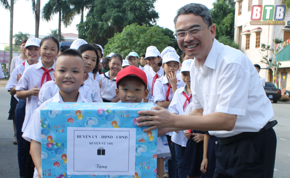 Nhân dịp này, đồng chí Phó Bí thư Tỉnh ủy, Chủ tịch UBND tỉnh và đồng chí Chỉ huy trưởng Bộ CHQS tỉnh, lãnh đạo Huyện ủy, UBND huyện Vũ Thư đã trao quà cho trẻ em và 20 suất học bổng cho học sinh nghèo vượt khó của thị trấn Vũ Thư và xã Minh Quang.