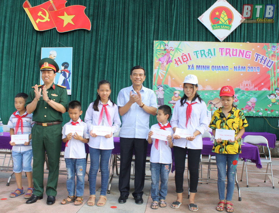 Đồng chí Đặng Trọng Thăng, Phó Bí thư Tỉnh ủy, Chủ tịch UBND tỉnh; đồng chí Nguyễn Đức Dũng, Ủy viên Ban Thường vụ Tỉnh ủy, Chỉ huy trưởng Bộ CHQS tỉnh tặng quà trung thu cho thiếu nhi xã Minh Quang