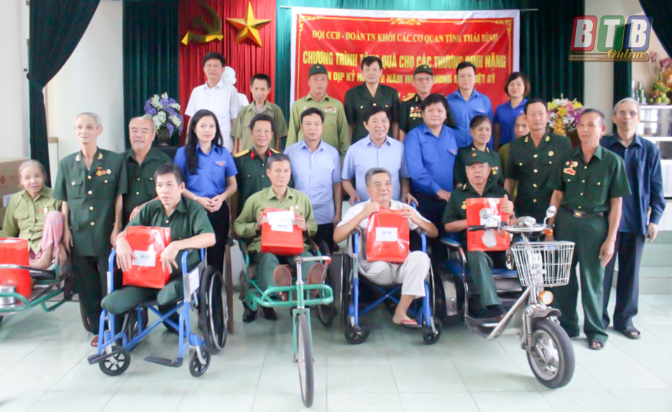 Hội Cựu chiến binh - Đoàn Thanh niên Khối các cơ quan tỉnh Thái Bình tặng quà cho các thương binh, bệnh binh nặng tại Trung tâm Nuôi dưỡng và Phục hồi chức năng người có công tỉnh. Ảnh: Thanh Huyền