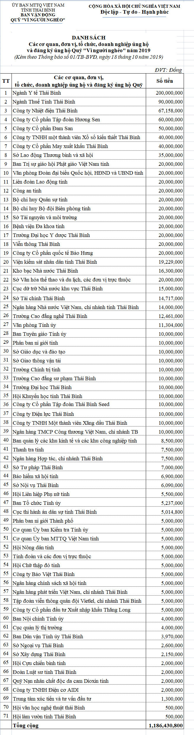 Kết quả các cơ quan, đơn vị, tổ chức, doanh nghiệp ủng hộ và đăng ký ủng hộ Quỹ “Vì người nghèo” năm 2019