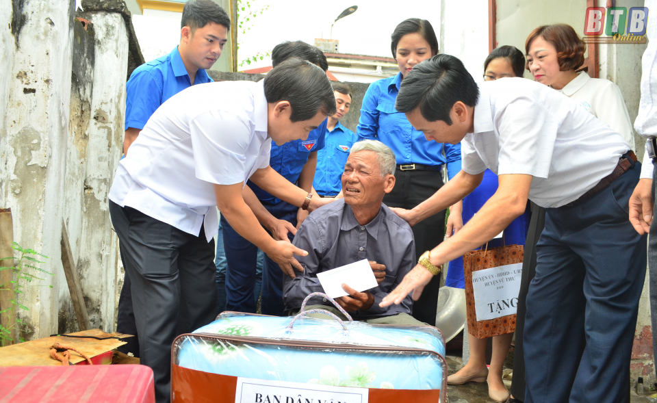 Đồng chí Nguyễn Tiến Thành, Ủy viên Ban Thường vụ, Trưởng ban Dân vận Tỉnh ủy và lãnh đạo huyện Vũ Thư tặng quà ông Bùi Văn Tín, thôn Ô Mễ 3, xã Tân Phong.