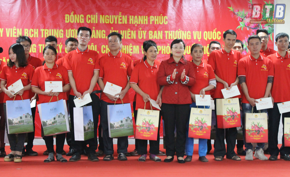 Nhân dịp này, đồng chí Nguyễn Hạnh Phúc, Ủy viên Trung ương Đảng, Ủy viên Ban Thường vụ Quốc hội, Tổng Thư ký Quốc hội, Chủ nhiệm Văn phòng Quốc hội và các đồng chí lãnh đạo Văn phòng Quốc hội, Tổng Liên đoàn Lao động Việt Nam, Liên đoàn Lao động tỉnh đã trao 130 suất quà cho công nhân lao động đang làm việc tại Công ty Cổ phần quốc tế Bảo Hưng, động viên người lao động vui tết, đón xuân.