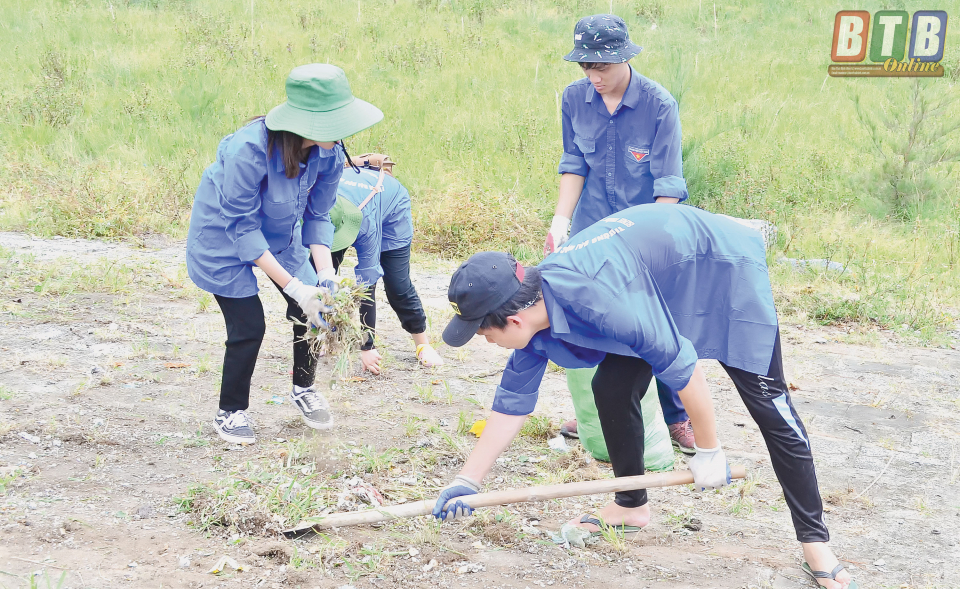 Đoàn viên thanh niên thu gom, phân loại rác thải trên tuyến đê thuộc địa phận xã Nam Thịnh (Tiền Hải).